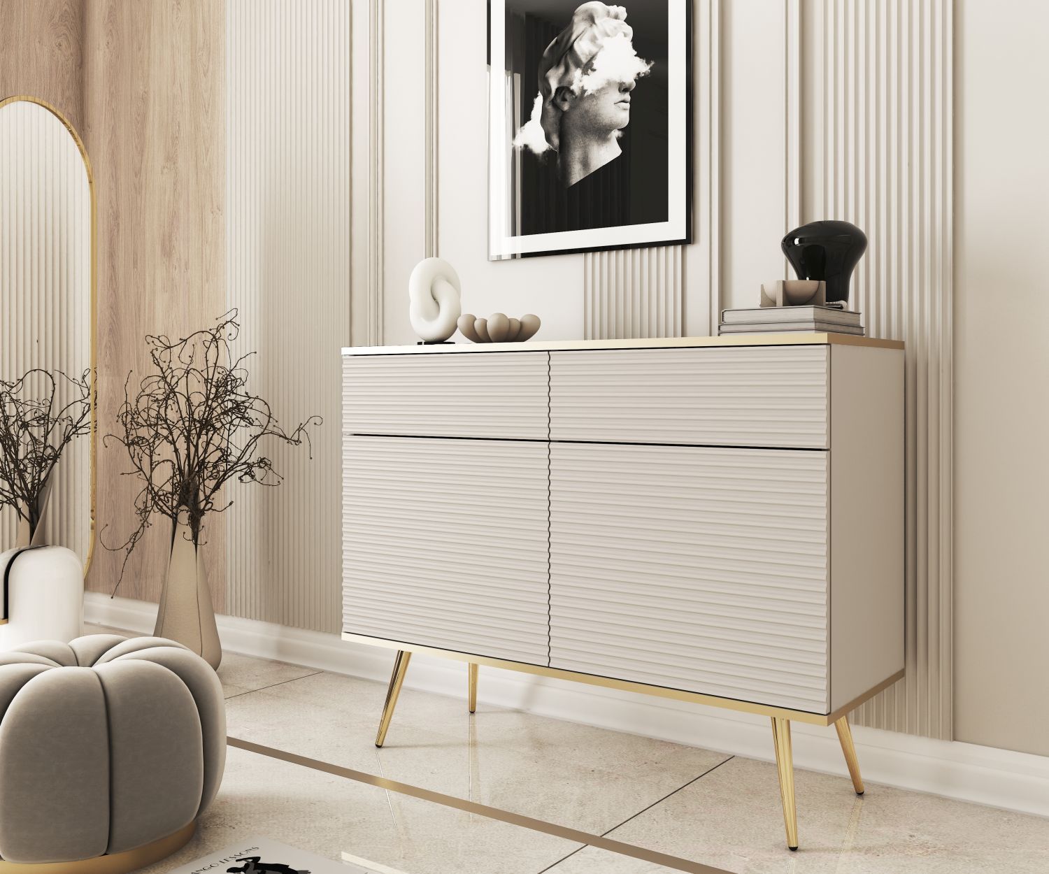 Komoda dwudrzwiowa CARO z dwiema szufladami 107 cm ryflowany front, beż, złoty