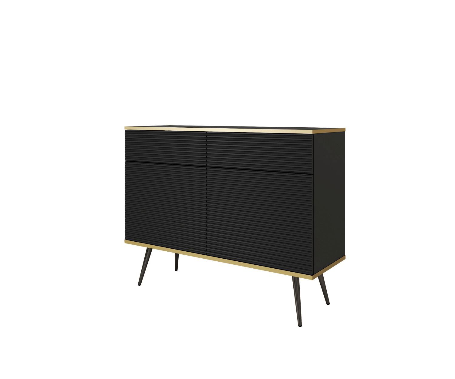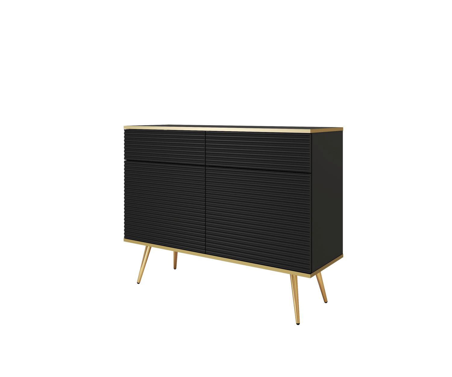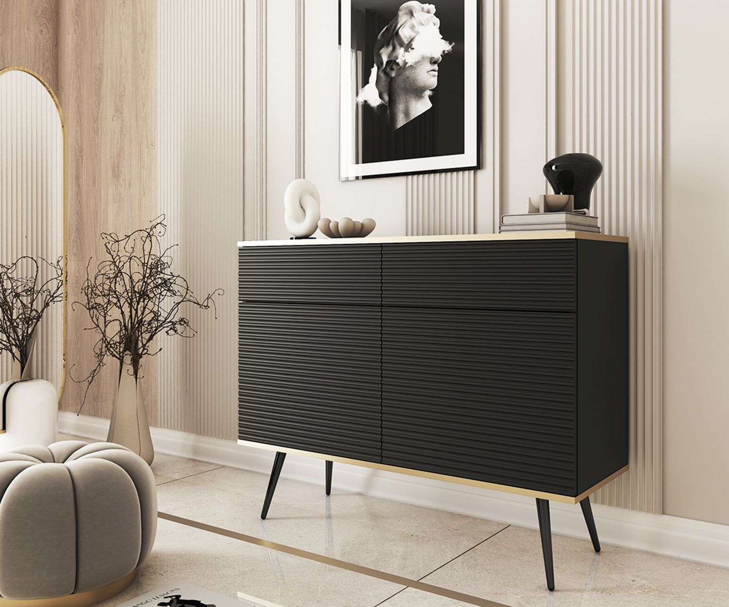 Szukasz komody, która doda wnętrzu elegancji i nowoczesnego charakteru? Model CARO o szerokości 107 cm w kolorze czarnym ze złotymi akcentami to wyjątkowy mebel, który łączy styl glamour z minimalistyczną formą. Ryflowane fronty i dopracowane detale nadają mu luksusowego wyglądu, idealnego do nowoczesnych przestrzeni.Komoda wyposażona w dwoje drzwi oraz dwie praktyczne szuflady zapewnia komfortowe miejsce do przechowywania drobiazgów, tekstyliów czy dokumentów. Metalowe nogi nadają całości lekkości i stabilności, a eleganckie połączenie czerni i złota podkreśla wyszukany styl mebla. To doskonały wybór do salonu, sypialni lub przedpokoju.