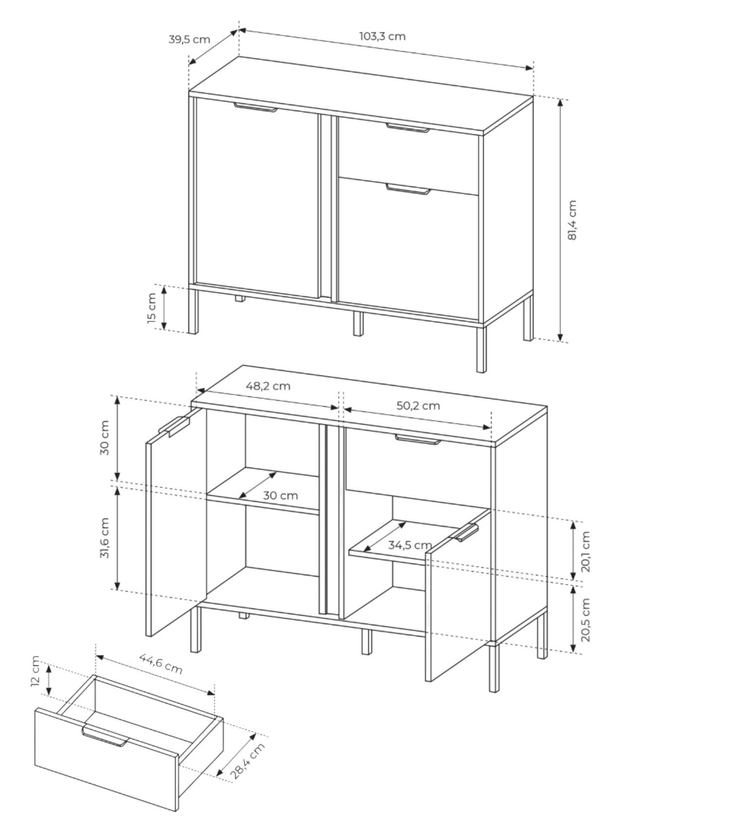 Minimalizm i elegancja w nowoczesnym wydaniu. Komoda MARI o szerokości 103 cm w kolorze antracyt to doskonały wybór dla miłośników prostych, a zarazem stylowych form. Jej matowe fronty podkreślone subtelnymi złotymi akcentami tworzą efektowne połączenie, które dodaje wnętrzu klasy i charakteru.Mebel wyposażony jest w dwoje drzwi oraz jedną pojemną szufladę, dzięki czemu idealnie sprawdzi się jako praktyczne miejsce do przechowywania. Smukła konstrukcja i wysokie nogi dodają jej lekkości, a nowoczesne uchwyty podkreślają elegancki wygląd całości.