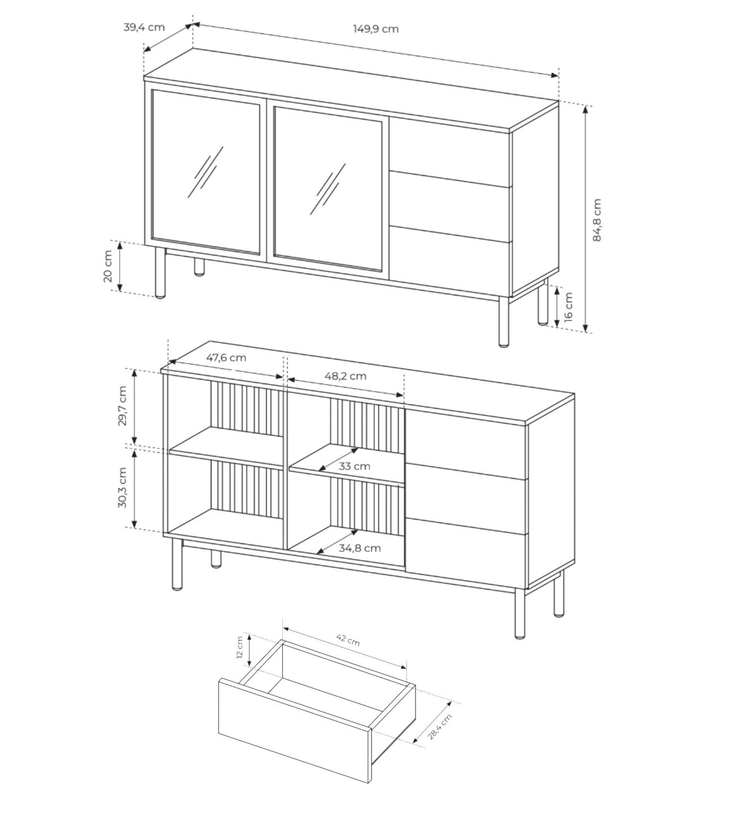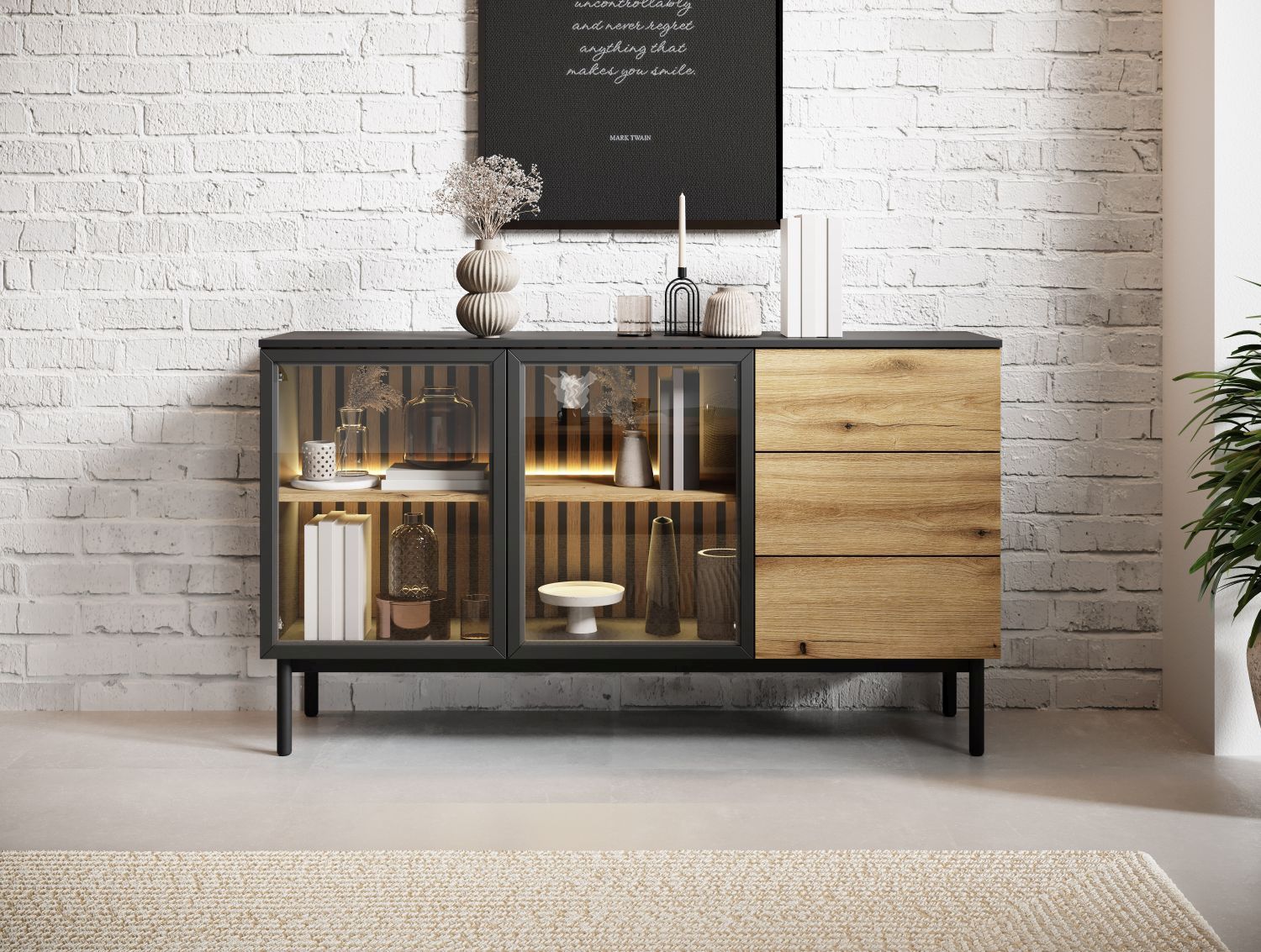 Komoda dwudrzwiowa NONNA z trzema szufladami, lamele, LED 149 cm czarny
