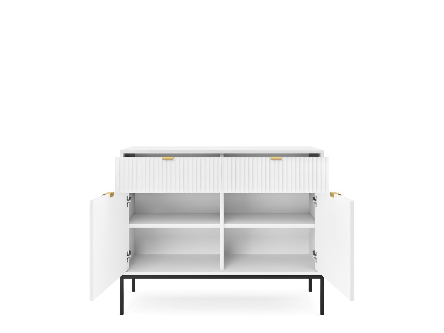 Szukasz komody, która połączy stylowy wygląd z praktycznym układem? Model ORT o szerokości 104 cm w kolorze białym to elegancki mebel o ryflowanym froncie, który wprowadzi do wnętrza nowoczesny charakter i lekkość. Doskonale sprawdzi się zarówno w salonie, jak i w sypialni czy przedpokoju.Komoda wyposażona w dwoje drzwi oraz dwie funkcjonalne szuflady zapewnia wygodne miejsce do przechowywania różnych akcesoriów, dokumentów czy tekstyliów. Metalowe nogi nadają konstrukcji stabilności i subtelnej elegancji, a biały kolor optycznie rozjaśnia pomieszczenie, wprowadzając do niego harmonię i porządek.