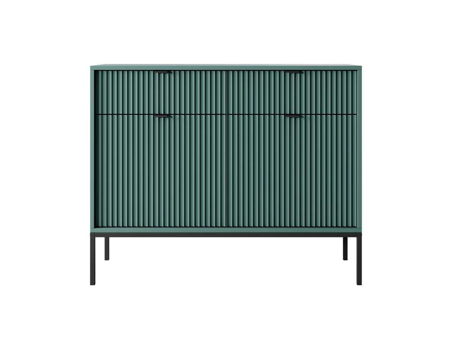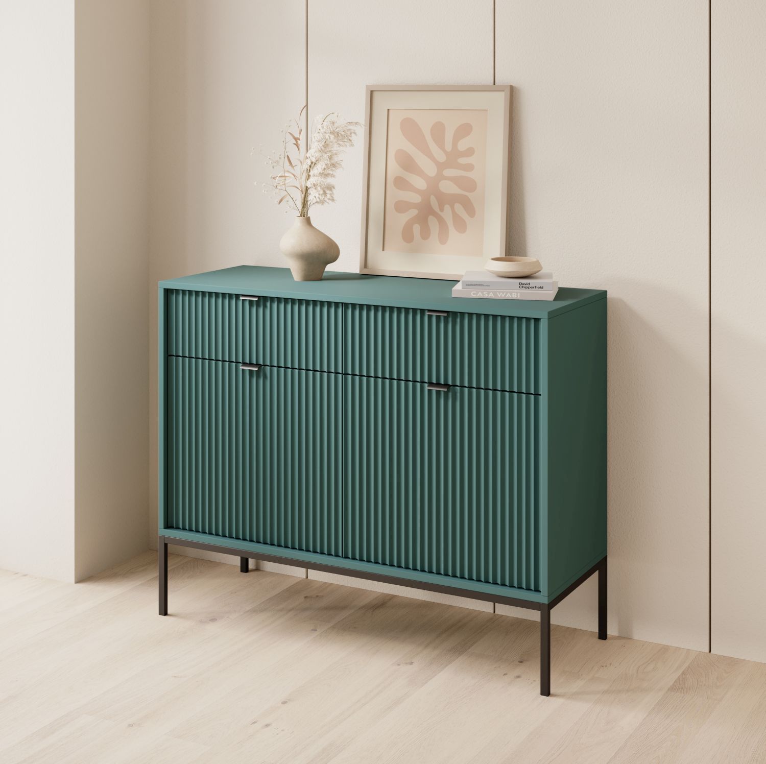 Szukasz komody, która łączy elegancję i praktyczne rozwiązania? Model ORT o szerokości 104 cm w kolorze zielonym to propozycja dla miłośników nowoczesnego designu i subtelnych detali. Ryflowany front nadaje jej wyrazisty charakter, a smukła forma na metalowych nogach wprowadza do wnętrza lekkość.Komoda wyposażona w dwoje drzwi oraz dwie pojemne szuflady zapewnia wygodną organizację przestrzeni. Doskonale sprawdzi się w salonie, sypialni lub przedpokoju, oferując miejsce na przechowywanie dokumentów, tekstyliów czy akcesoriów. Głęboka zieleń frontów tworzy elegancki kontrast i dodaje wnętrzu nowoczesnego charakteru.