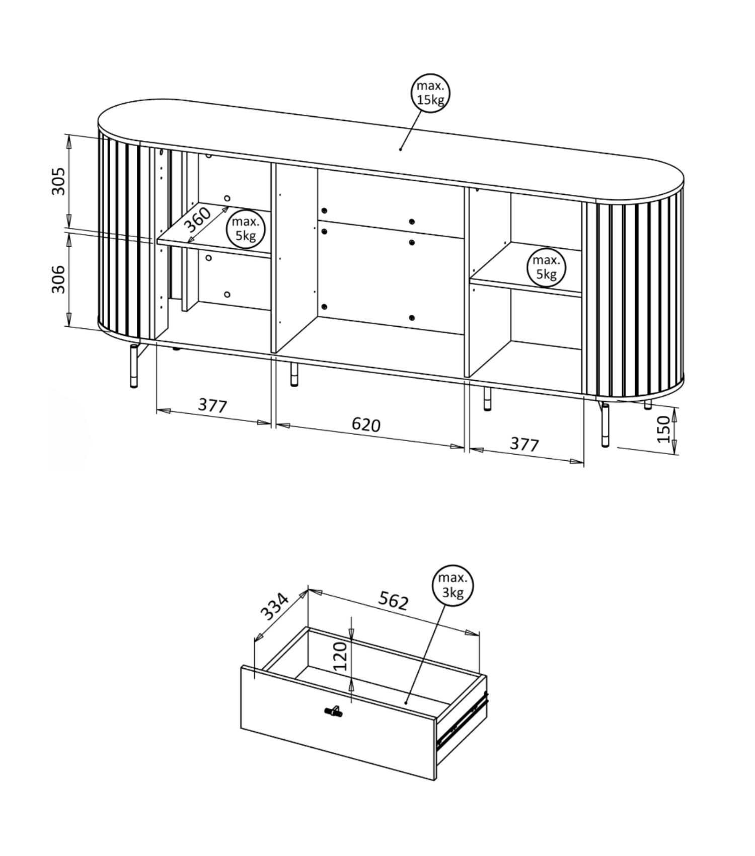 Komoda dwudrzwiowa VORIS D 190 cm z trzema szufladami zaokrąglone boki czarny