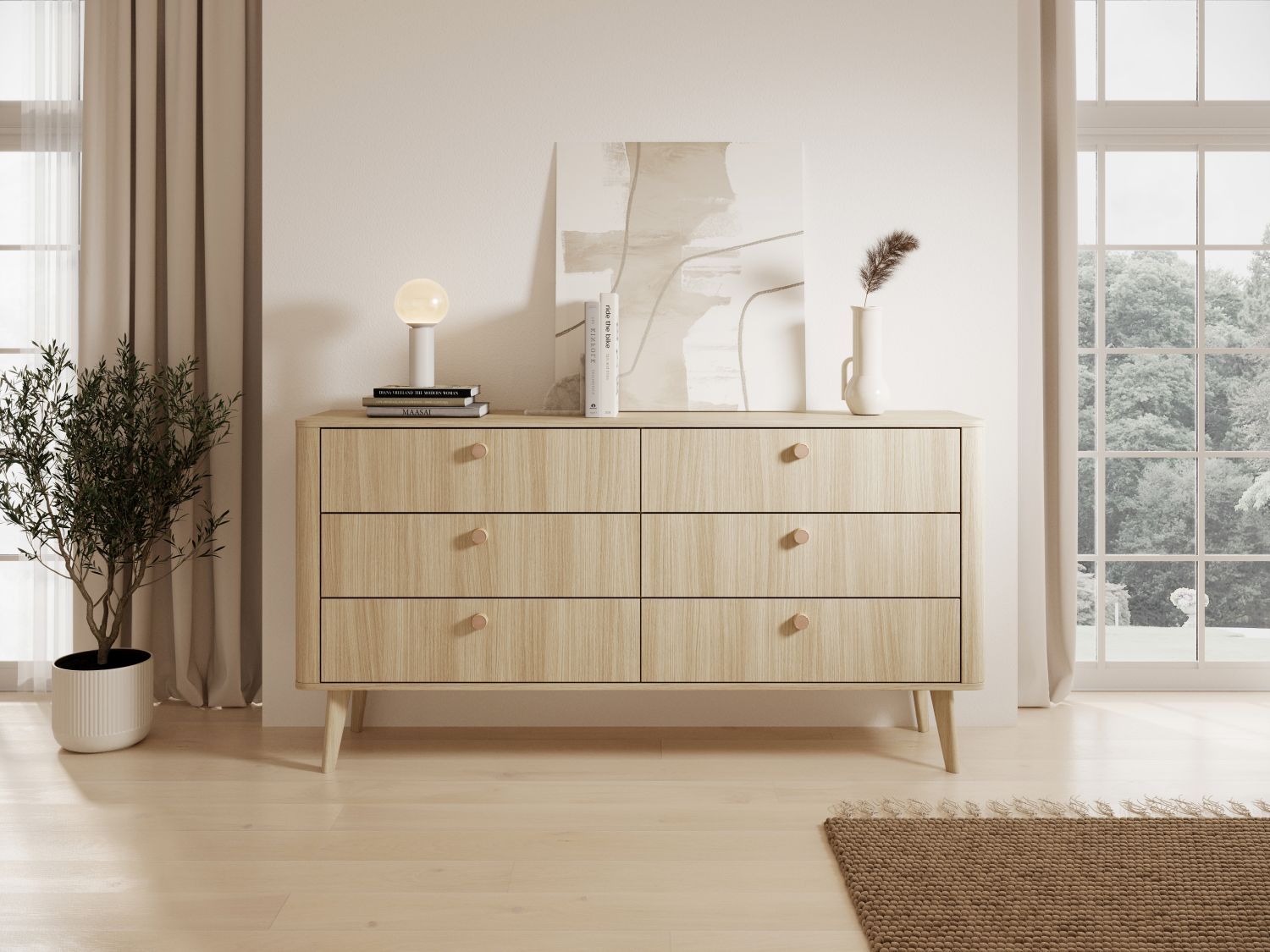 Komoda MOLLY to idealne połączenie prostoty, funkcjonalności i elegancji. Jej subtelny design w wybarwieniu dąb barista wprowadza do wnętrza ciepło i harmonię, a lekko zwężane nóżki nadają całości lekkości w stylu skandynawskim.Mebel o szerokości 163 cm wyposażony jest w sześć pojemnych szuflad, które pozwalają na wygodne przechowywanie ubrań, akcesoriów czy dokumentów. Komoda świetnie sprawdzi się w sypialni, salonie lub przedpokoju, stanowiąc nie tylko praktyczny, ale też stylowy element wystroju.