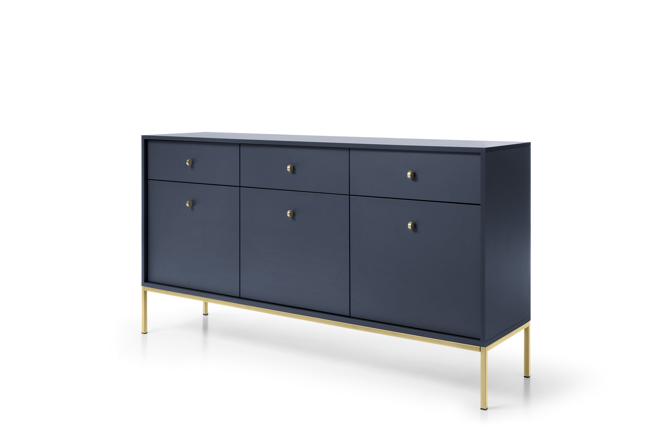 Szukasz eleganckiej komody, która zachwyci nowoczesnym wyglądem i praktycznym wnętrzem? Model NUO o szerokości 153 cm w kolorze granatowym to propozycja, która doskonale łączy styl i funkcjonalność. Jej minimalistyczna forma, gładkie matowe fronty oraz delikatne złote uchwyty tworzą wyjątkowo harmonijną całość, idealną do salonu, jadalni czy sypialni.Za trzema drzwiami i w trzech pojemnych szufladach ukryto sporo miejsca na codzienne drobiazgi, tekstylia czy dokumenty. Całość wspiera się na metalowej, smukłej podstawie, która nadaje lekkości i subtelnej elegancji.