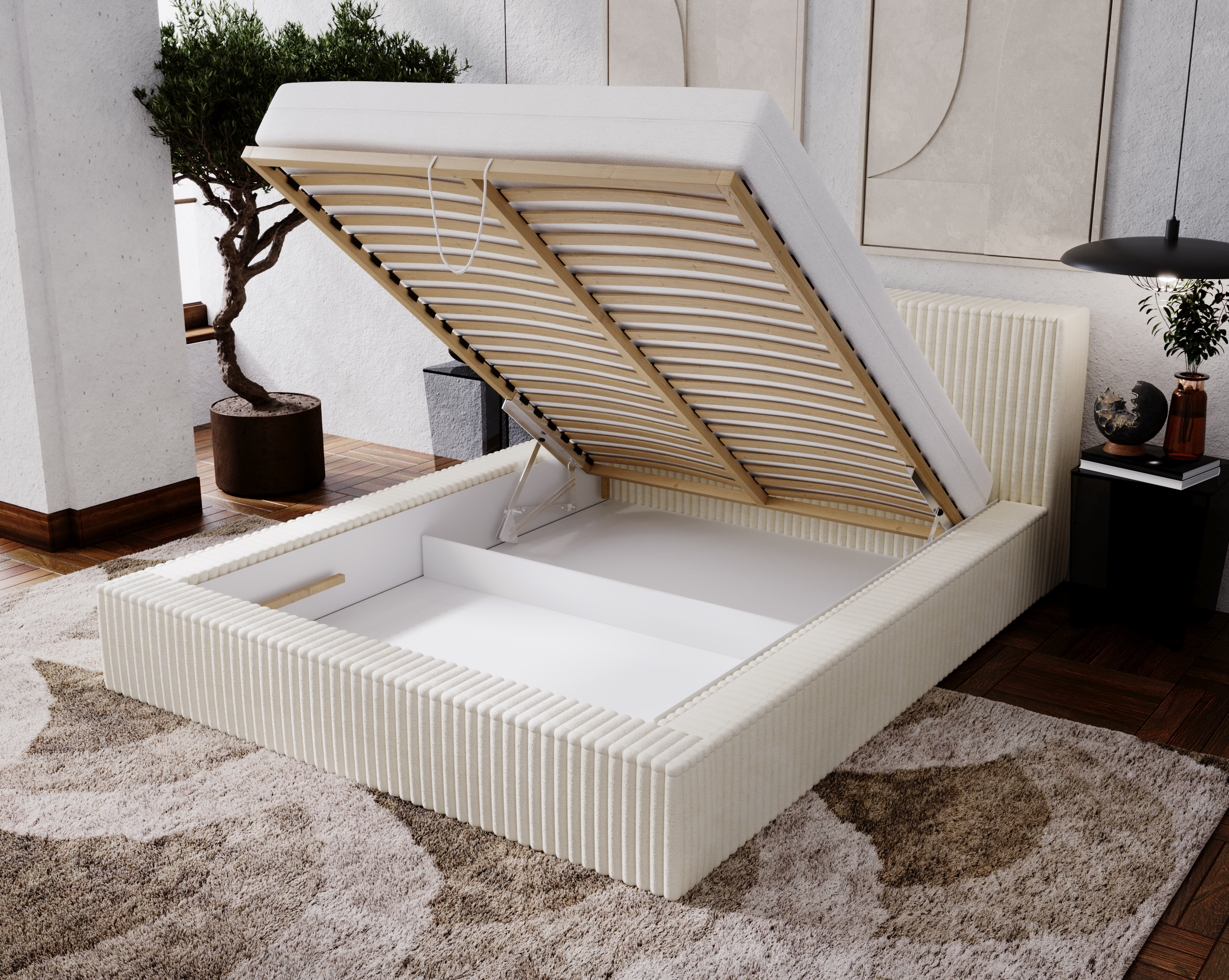 Pod powierzchnią spania znajduje się przestronny pojemnik na pościel, który idealnie sprawdzi się do przechowywania koców, poduszek i innych tekstyliów. Mechanizm otwierania wspomagany siłownikami gazowymi umożliwia lekkie i płynne unoszenie stelaża, zapewniając wygodny dostęp do wnętrza. Łóżko MODERN 160x200 to połączenie estetyki, praktyczności i codziennej wygody.