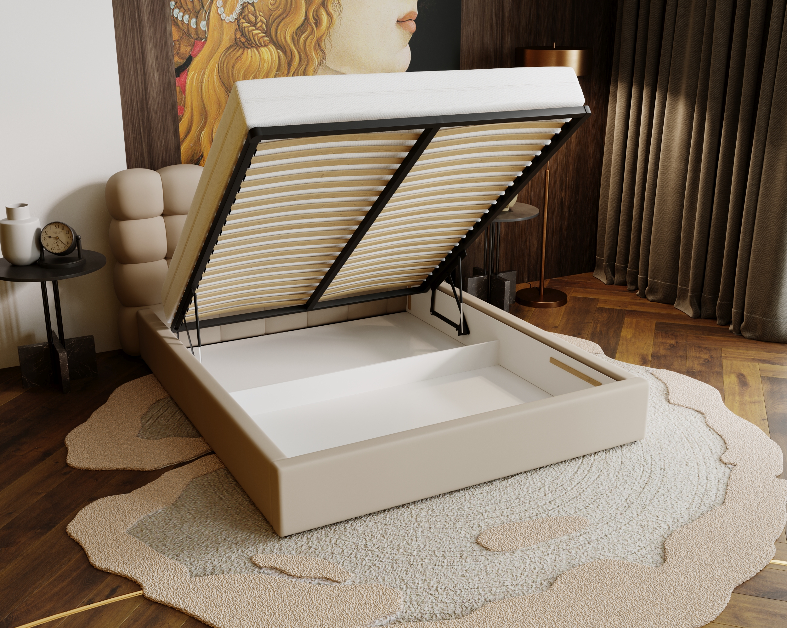 Pod powierzchnią spania umieszczono przestronny pojemnik na pościel, który idealnie sprawdzi się do przechowywania koców, poduszek i innych akcesoriów. Mechanizm otwierania wspomagany siłownikami gazowymi umożliwia lekkie i bezproblemowe unoszenie stelaża, zapewniając łatwy dostęp do wnętrza. Łóżko TIRA 160x200 łączy elegancję z funkcjonalnością, gwarantując wygodę i porządek w sypialni każdego dnia.