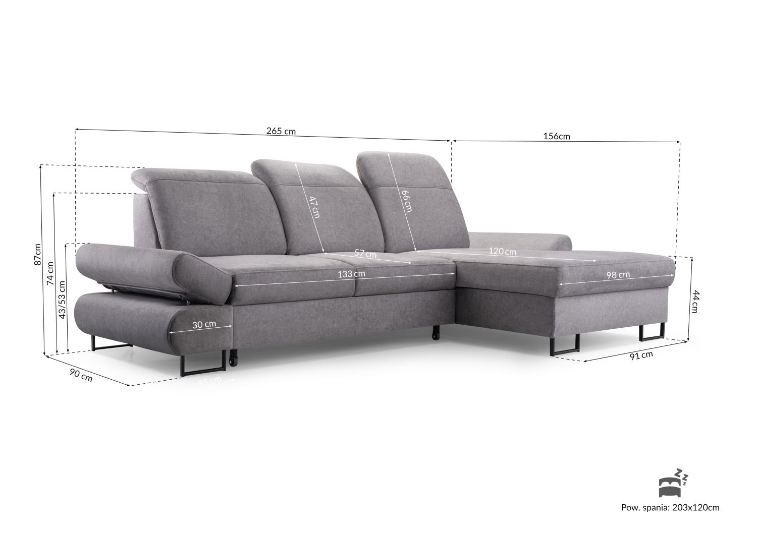 Dynamiczna forma i pełna funkcjonalność — narożnik CAPRI MINI to kompaktowy mebel o nowoczesnym charakterze, stworzony z myślą o ergonomii i komforcie. Jego L-kształtny układ doskonale dopasowuje się do wnętrz, oferując wygodną przestrzeń do wypoczynku.Model wyposażono w funkcję spania oraz praktyczny pojemnik na pościel, co czyni go idealnym wyborem do codziennego użytku. Regulowane zagłówki i szerokie podłokietniki pozwalają dopasować pozycję do indywidualnych preferencji, a metalowe nogi podkreślają jego nowoczesny wygląd. Całość prezentuje się elegancko i solidnie, gwarantując trwałość konstrukcji.