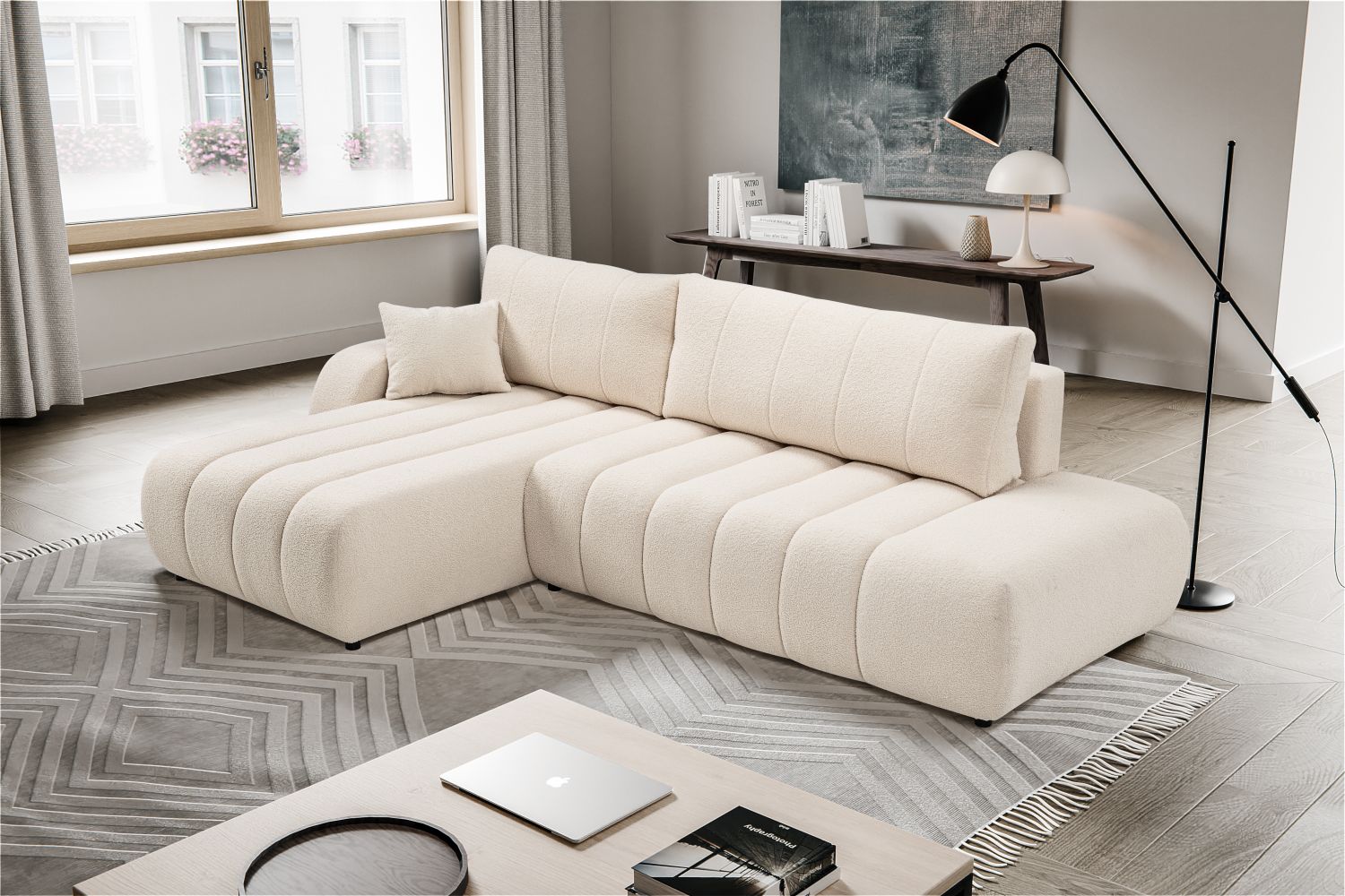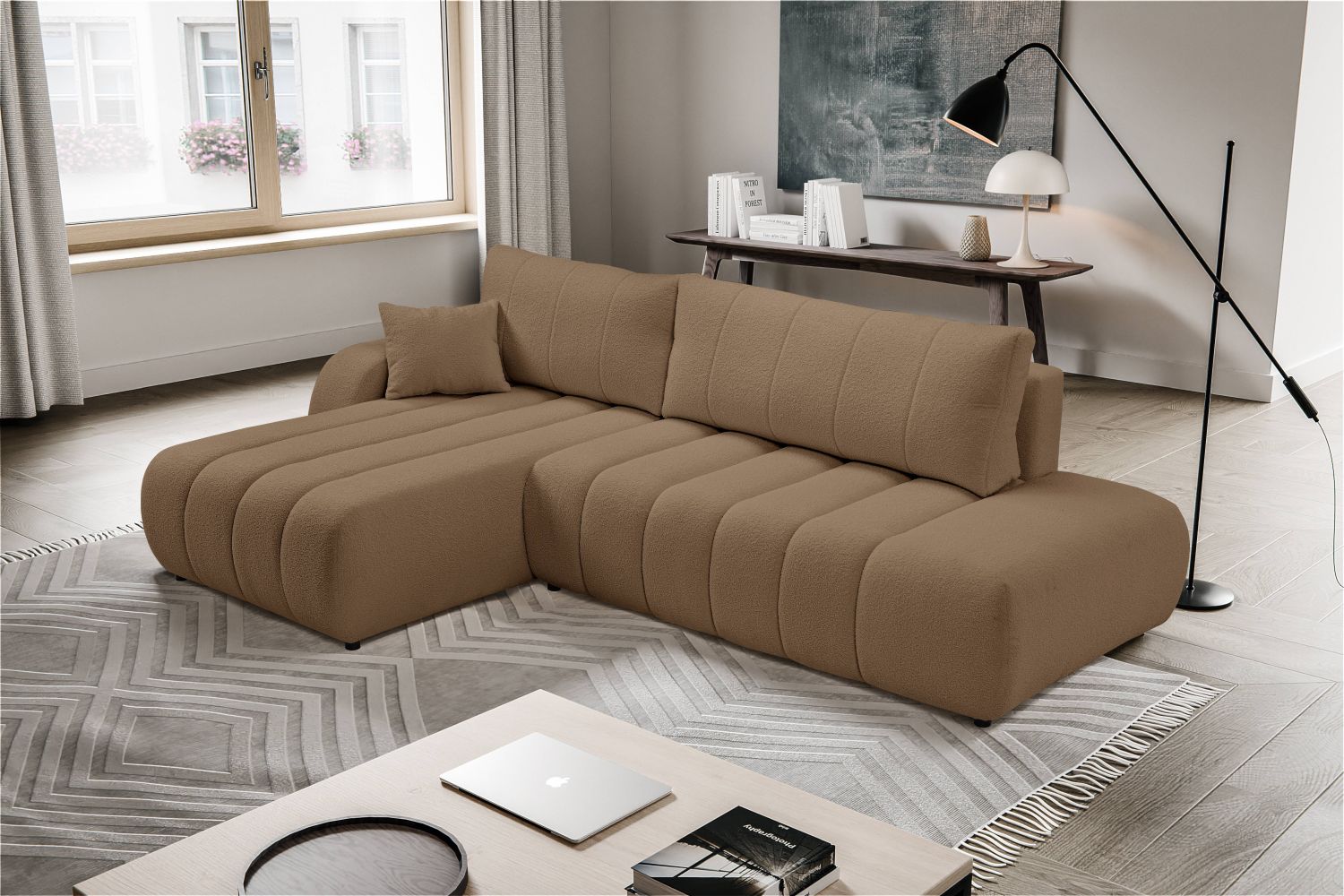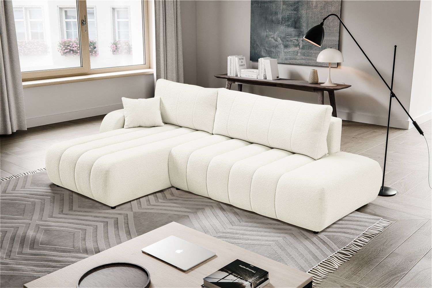 Narożnik DALMA to designerski mebel o niskiej, minimalistycznej formie, który wyróżnia się eleganckimi pionowymi przeszyciami na siedzisku i oparciu. L-kształtna konstrukcja doskonale dopasowuje się do nowoczesnych wnętrz, tworząc przestrzeń do relaksu i spotkań.Model wyposażony jest w funkcję spania oraz pojemnik na pościel, co zapewnia funkcjonalność na co dzień. Miękkie poduchy oparciowe i szerokie siedziska gwarantują wygodę, a brak widocznych nóg nadaje meblowi nowoczesny, osadzony wygląd.