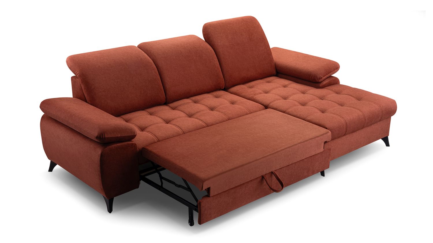 Styl i komfort w nowoczesnym wydaniu — narożnik MONTERO MINI to elegancki mebel, który łączy funkcjonalność z wyrazistym designem. Jego L-kształtny układ doskonale komponuje się z przestrzenią salonu, zapewniając wygodę w codziennym użytkowaniu.Model posiada funkcję spania oraz obszerny pojemnik na pościel, co czyni go praktycznym wyborem także dla mniejszych wnętrz. Regulowane zagłówki i szerokie podłokietniki zwiększają komfort, a eleganckie pikowane siedzisko i stabilne metalowe nogi nadają całości lekkości i nowoczesnego charakteru. Konstrukcja mebla gwarantuje trwałość i wygodę na lata.