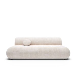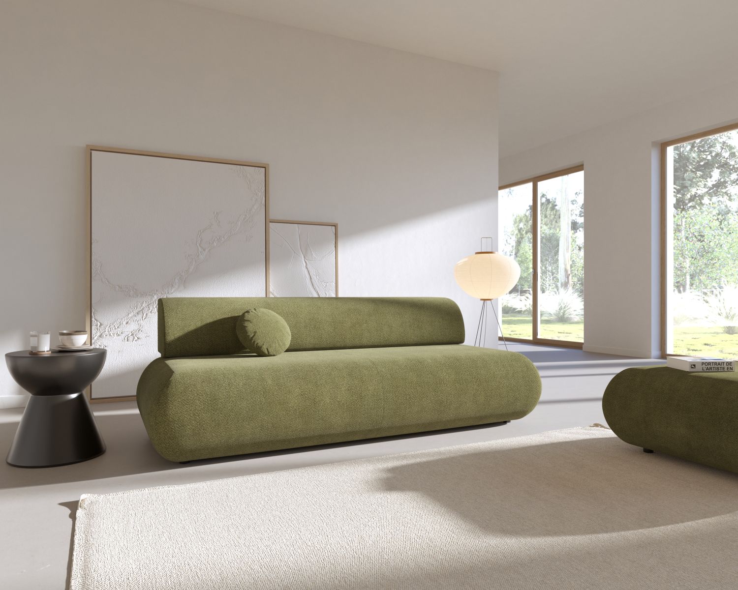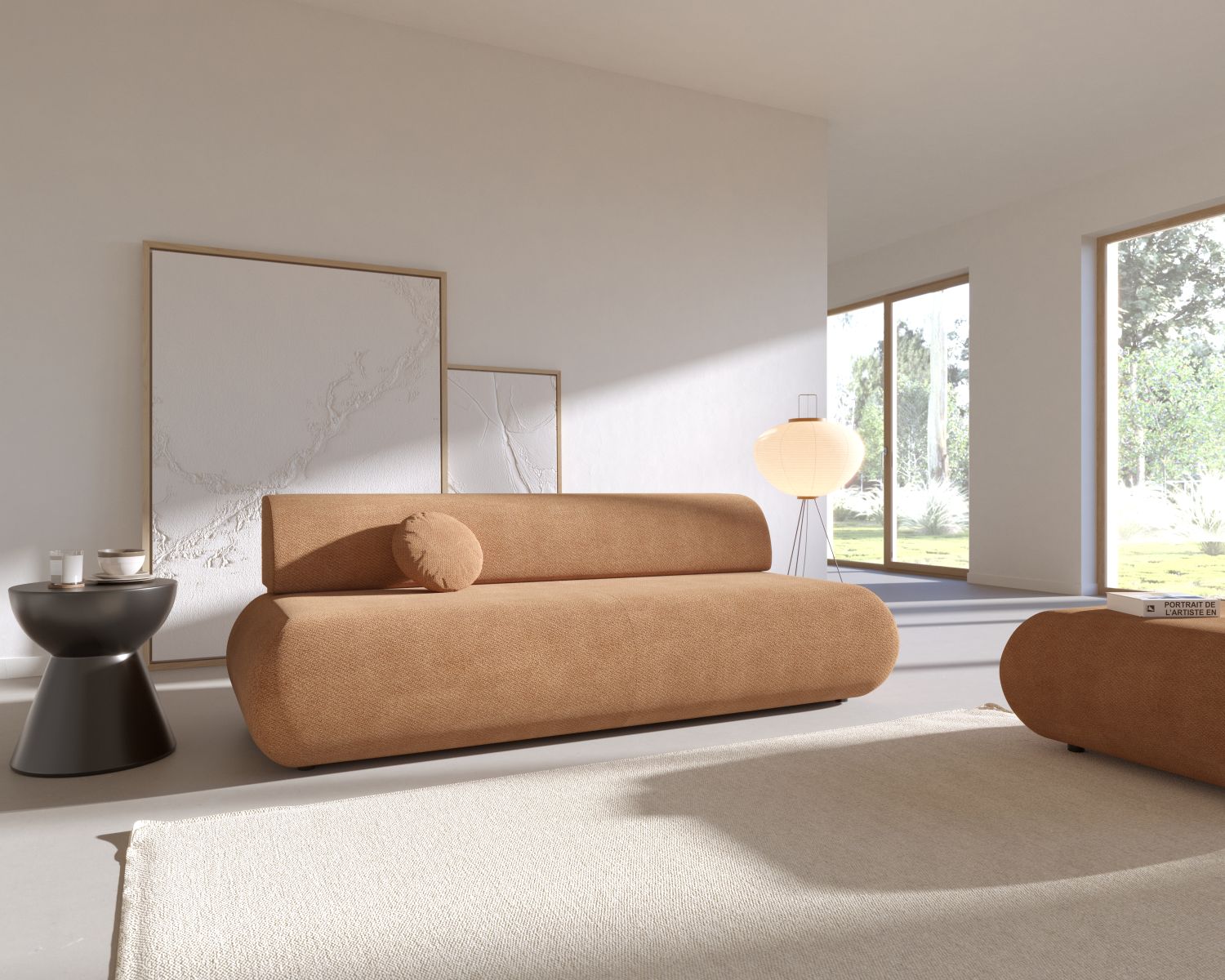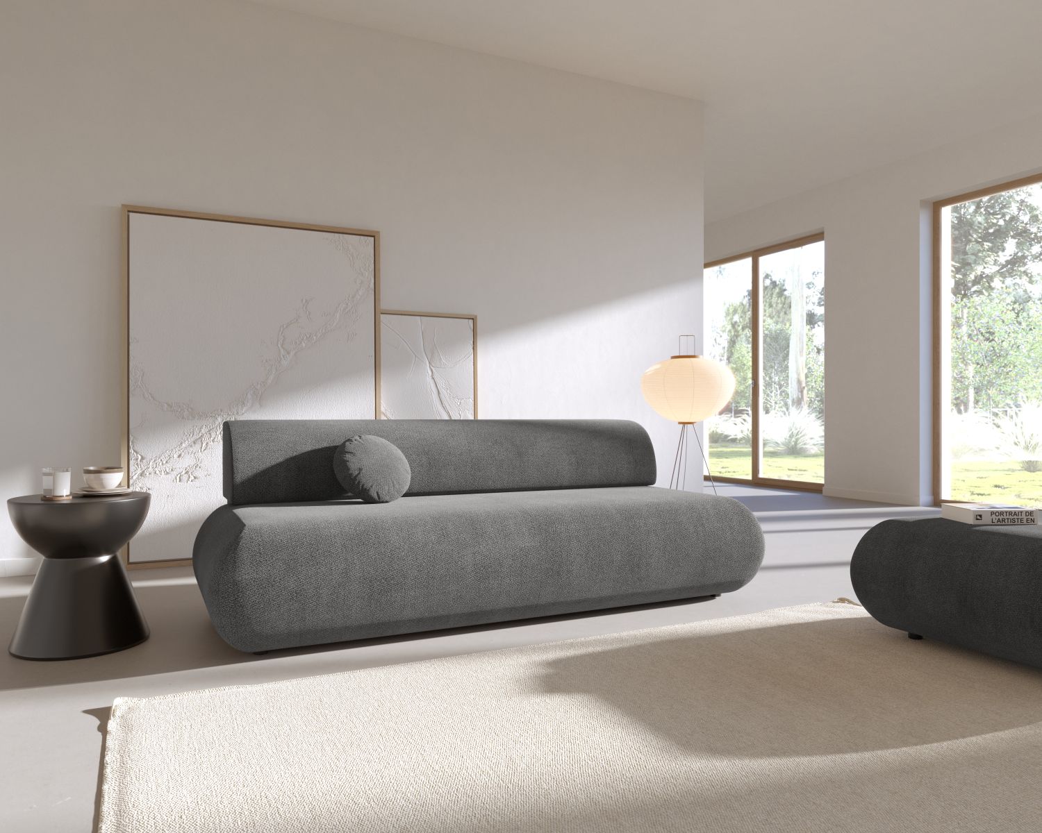 Szukasz designerskiej sofy, która przyciąga uwagę formą i gwarantuje wygodę na co dzień? Sofa BERRO to dwu–trzyosobowy model, który łączy oryginalny wygląd, funkcjonalność i komfort użytkowania. Jej charakterystyczna, obła bryła o miękkich liniach nadaje wnętrzu niepowtarzalny, nowoczesny styl.Sofa BERRO została wyposażona w funkcję spania, dzięki której w prosty sposób można przekształcić ją w wygodne łóżko do codziennego lub okazjonalnego odpoczynku. Dodatkowo posiada pojemnik na pościel, który pozwala przechowywać koce i poduszki, utrzymując porządek w salonie.Siedzisko z wysokiej jakości pianek zapewnia miękkość i sprężystość, a profilowane oparcie gwarantuje wsparcie dla kręgosłupa i wygodną pozycję podczas relaksu. Sofa wyróżnia się zaokrąglonymi krawędziami i zintegrowanym, walcowatym oparciem, które nadają jej nowoczesny, minimalistyczny charakter. Całość uzupełnia okrągła poduszka dekoracyjna, dodająca całości oryginalnego akcentu i przytulności.Obicie wykonano z trwałej, odpornej na ścieranie tkaniny, która zachowuje swój wygląd przez lata i jest łatwa w pielęgnacji. Starannie wykończony tył pozwala ustawić sofę w dowolnym miejscu – również w centralnej części pomieszczenia. Trwały szkielet gwarantuje stabilność i długotrwałe użytkowanie.Sofa BERRO to połączenie nowoczesnej estetyki, funkcjonalności i komfortu – doskonała propozycja dla osób, które szukają mebla o wyjątkowej formie i niepowtarzalnym stylu.