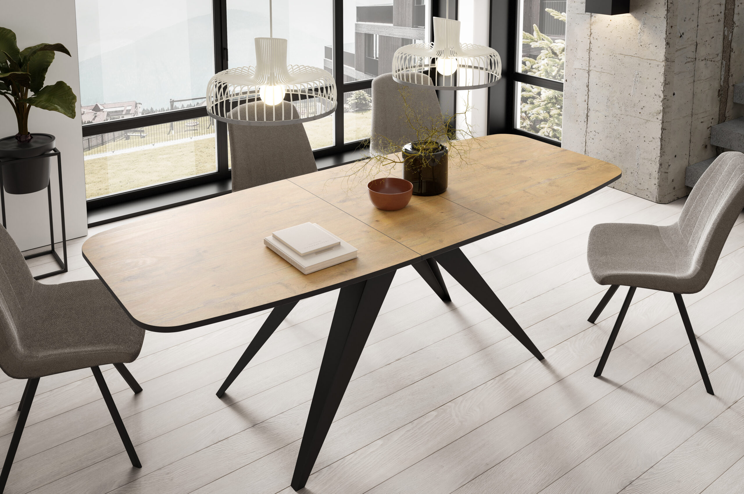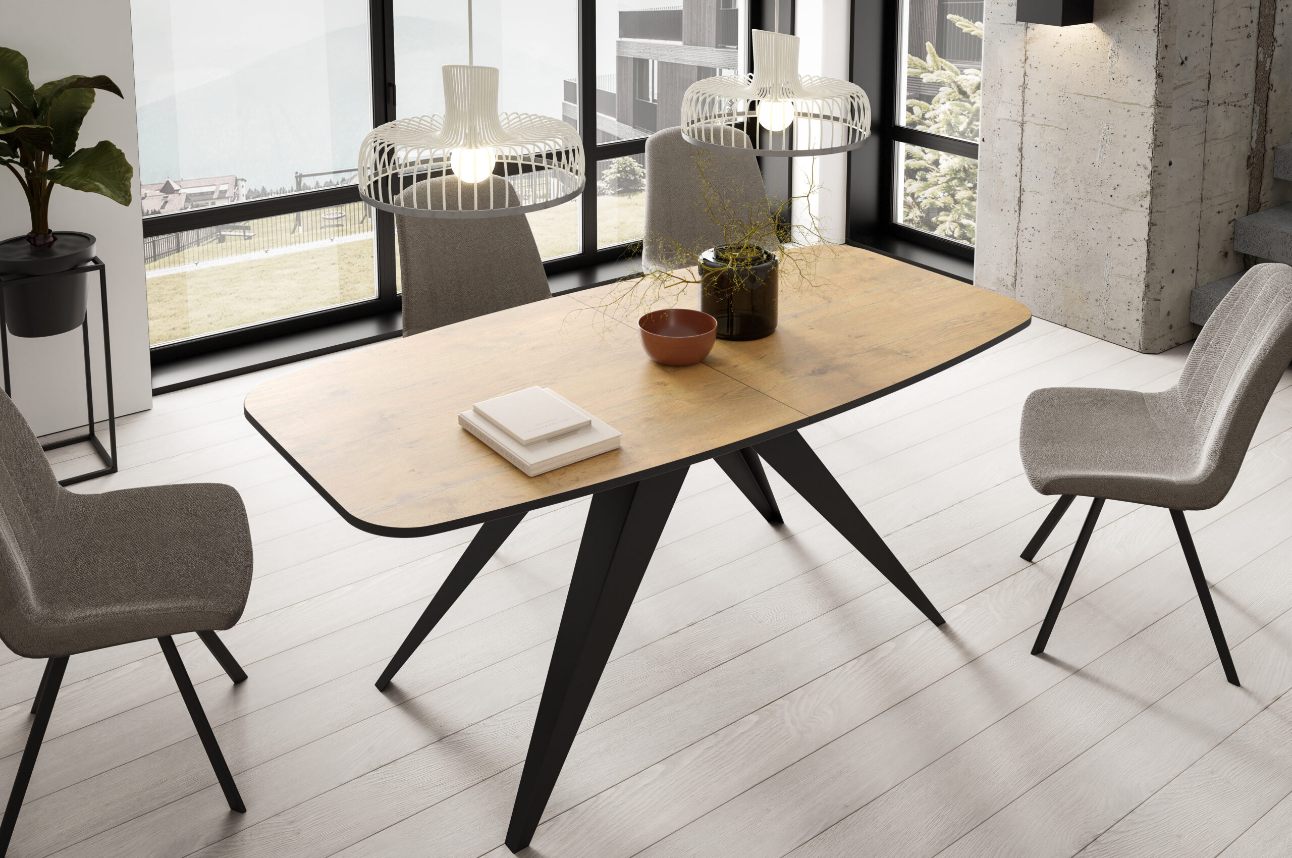 Stół ORBI w kolorze dąb lancelot łączy ciepły wygląd drewna z funkcjonalnym designem, stanowiąc efektowne uzupełnienie przestrzeni jadalnianych i salonowych.