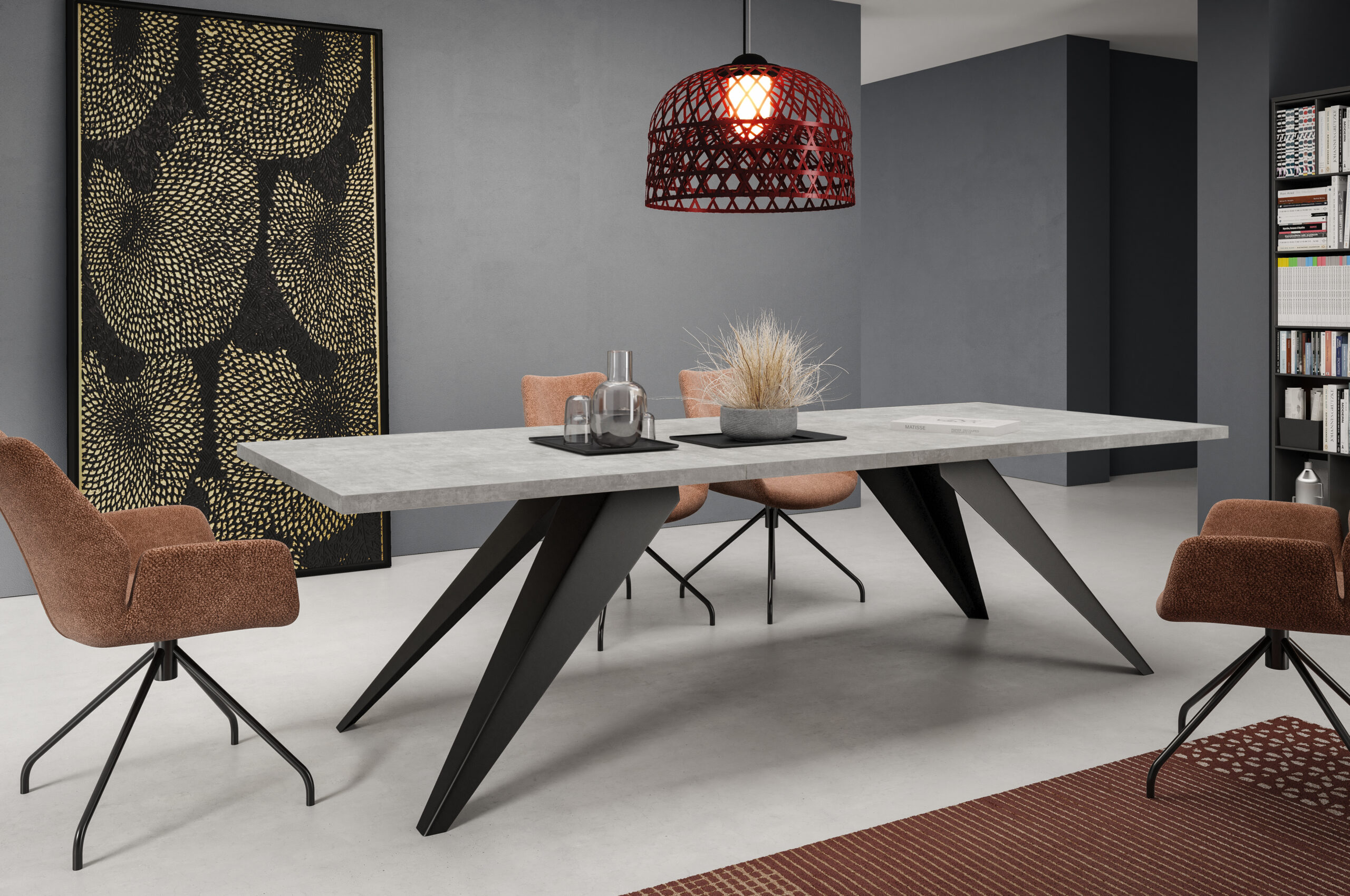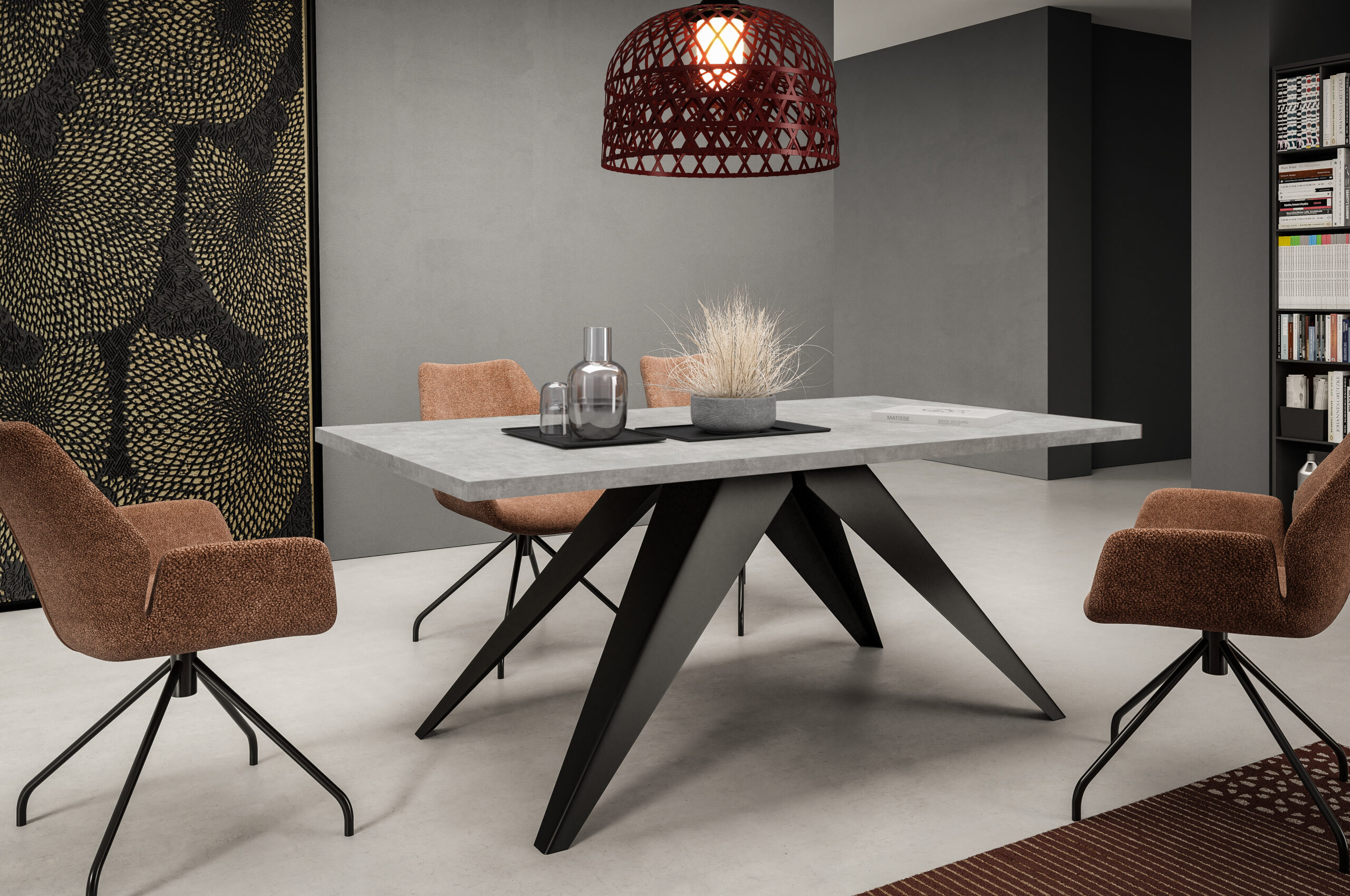 Stół SILK w kolorze beton bellato łączy nowoczesny design z funkcjonalnością, stanowiąc elegancki i praktyczny element wyposażenia jadalni.