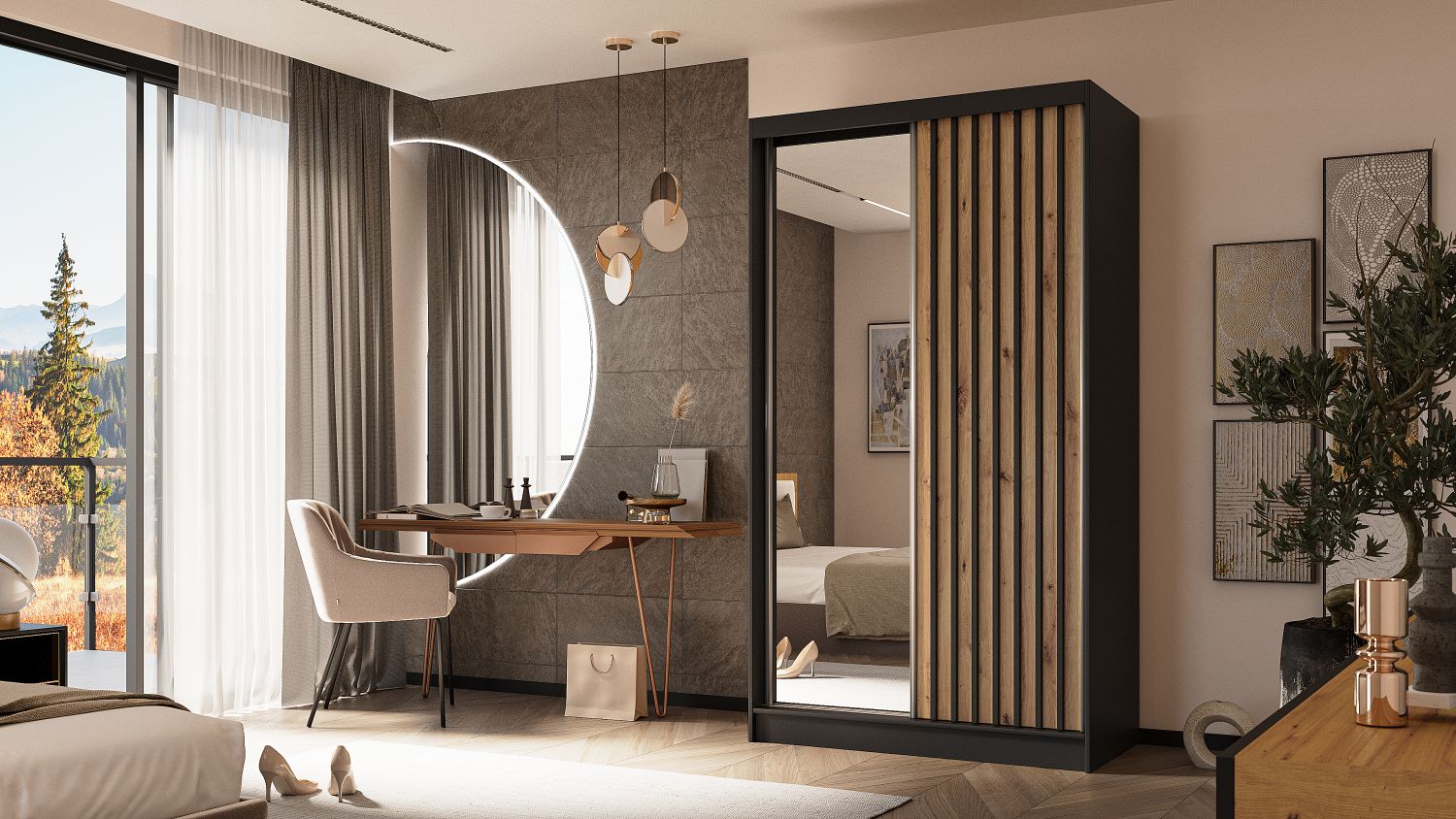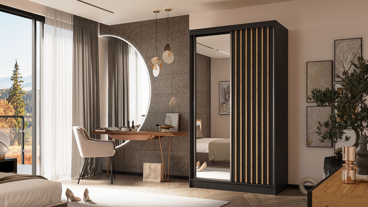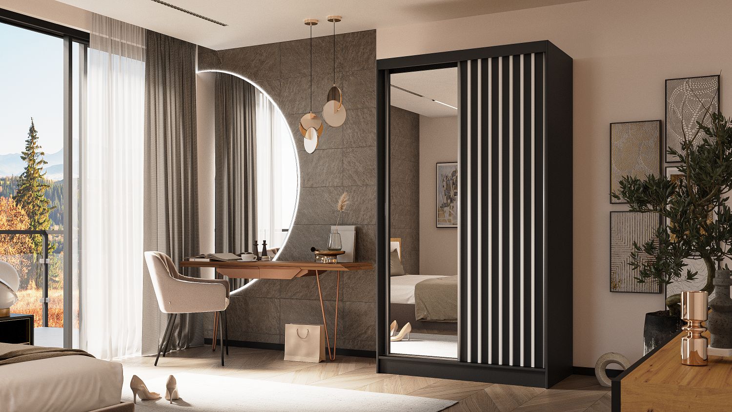 Nowoczesna elegancja i minimalistyczna forma definiują kolekcję ALMIRA, w której głęboka kolorystyka i dekoracyjne detale tworzą harmonijną całość. Czarne wykończenie i pionowe lamele nadają meblowi wyjątkowego, loftowego charakteru.