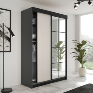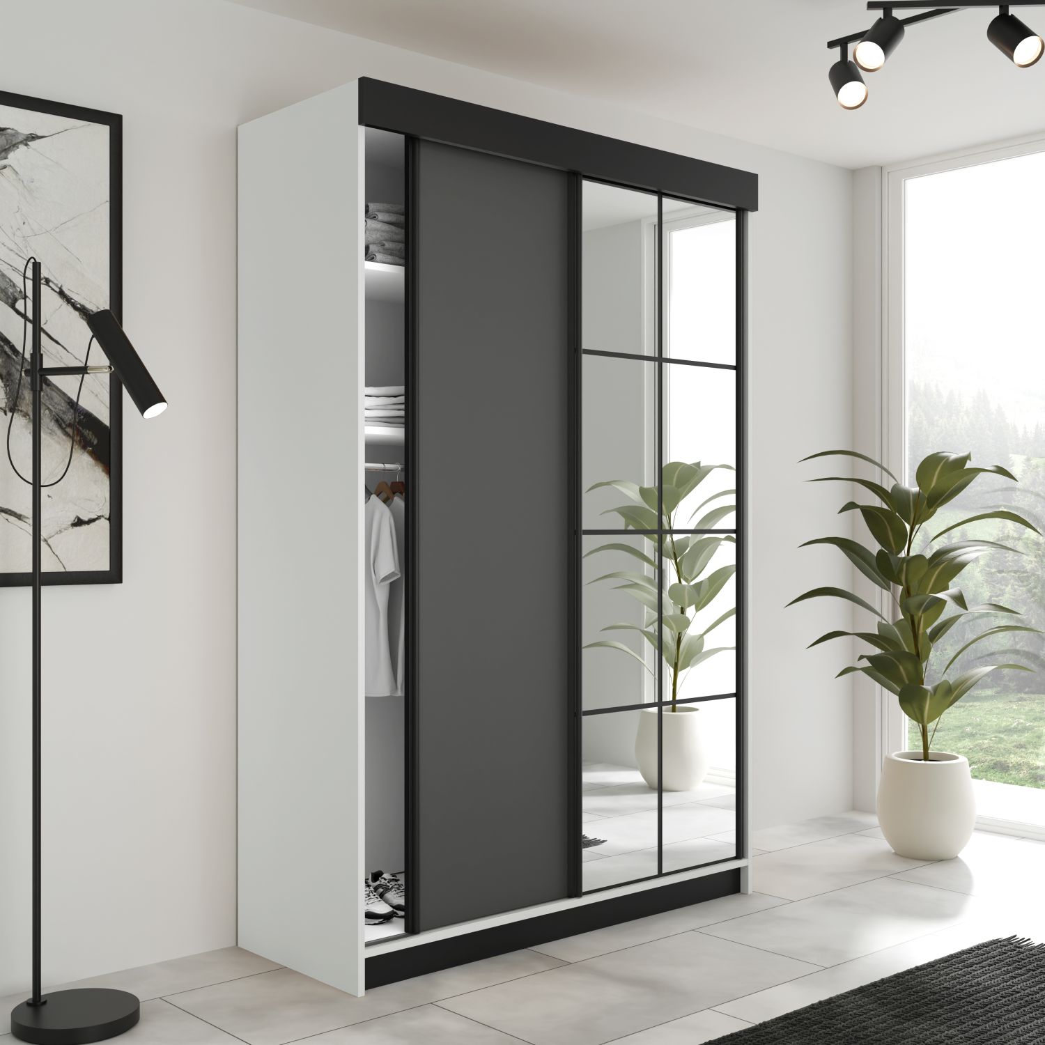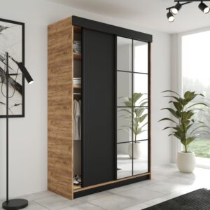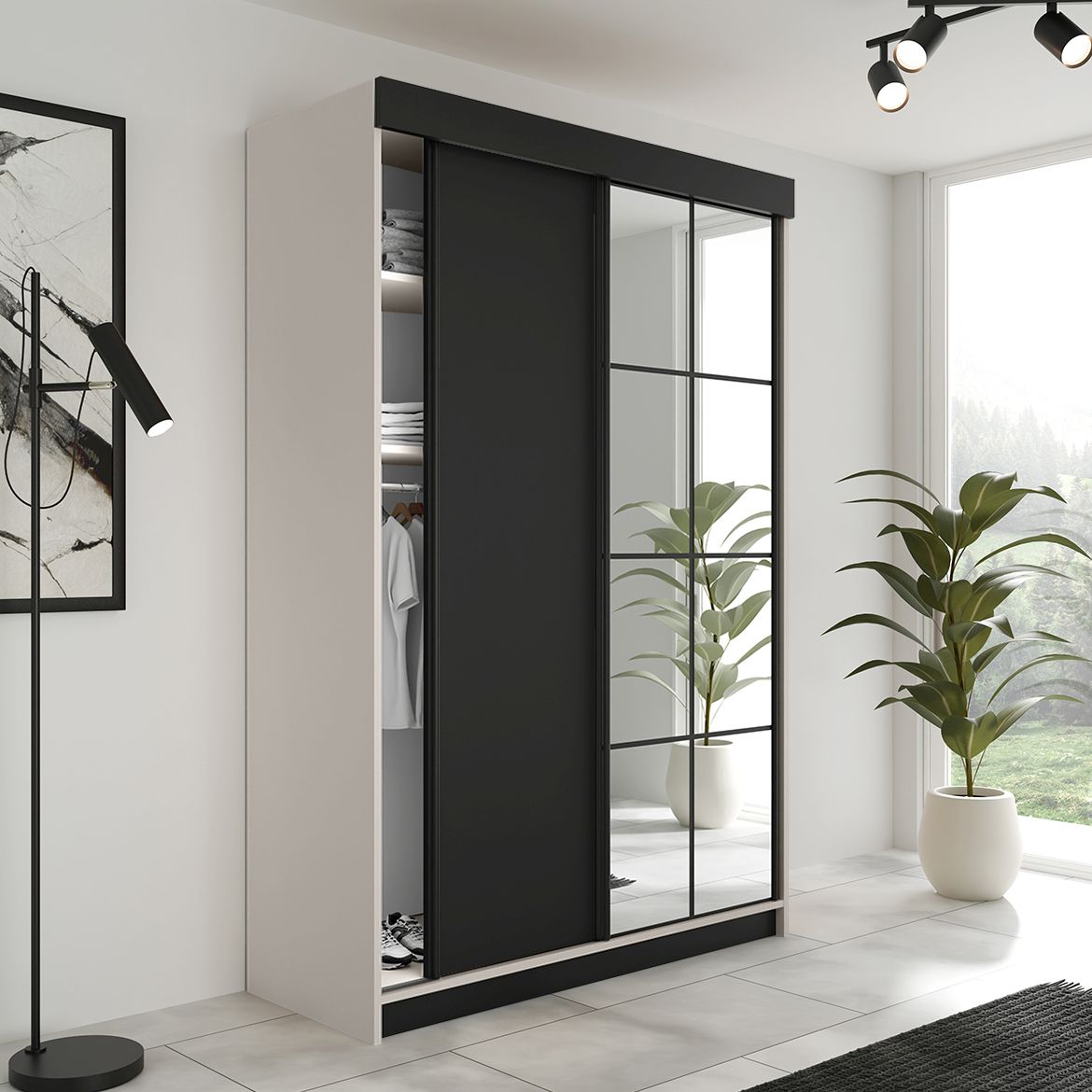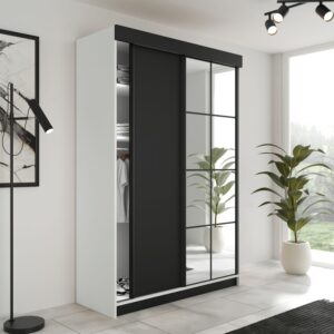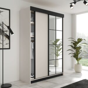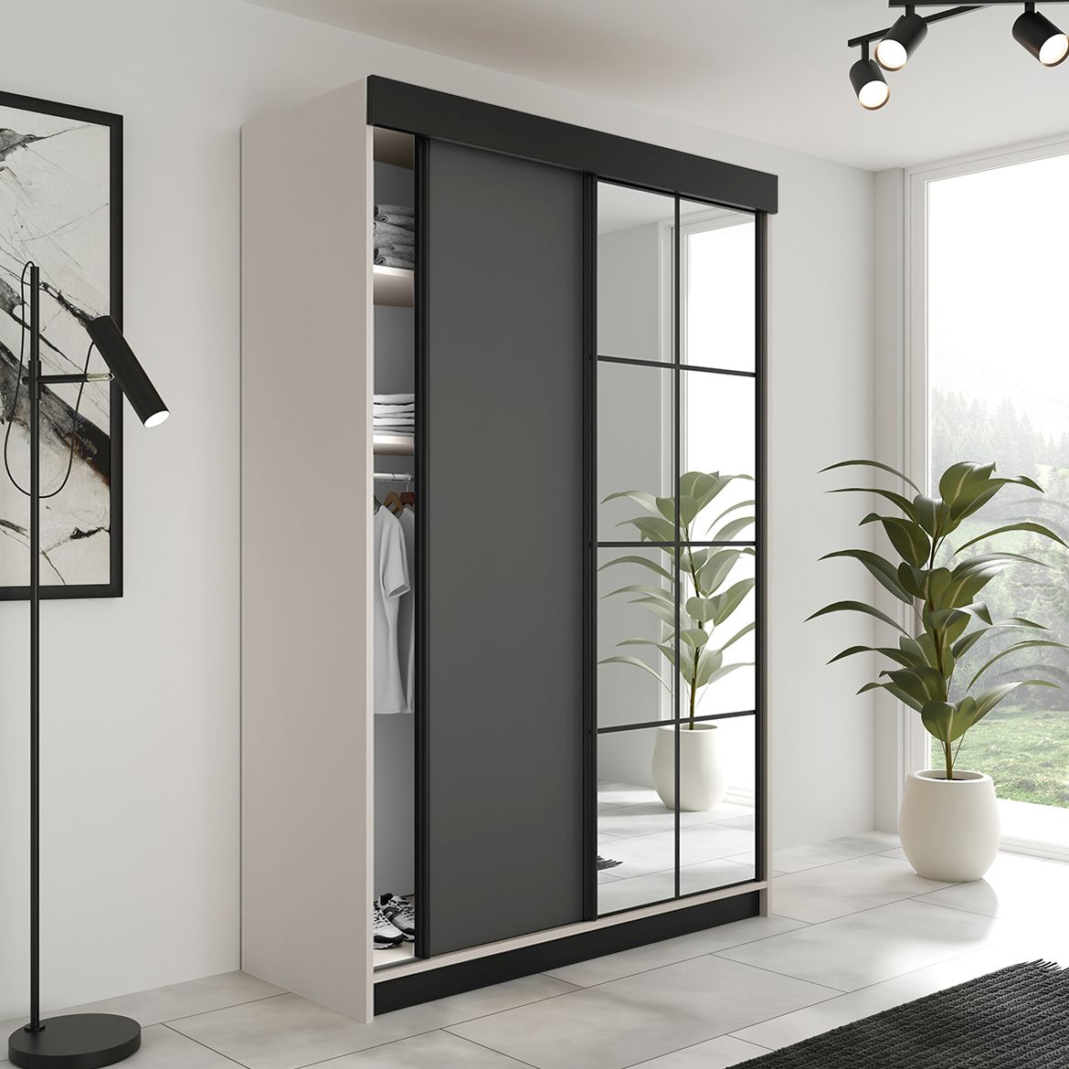 Szafa przesuwna ALVARO 138 cm z lustrem to nowoczesny i praktyczny mebel, idealny do sypialni, garderoby lub przedpokoju. Cechuje ją elegancki design z kontrastowym wykończeniem oraz funkcjonalne rozwiązania, które ułatwiają organizację przestrzeni.Model wyposażony jest w drzwi przesuwne, dzięki czemu doskonale sprawdza się nawet w mniejszych pomieszczeniach. Duże lustro z podziałami w stylu loftowym nadaje całości wyjątkowego charakteru i optycznie powiększa wnętrze. Wnętrze szafy zawiera drążek na ubrania oraz półki, zapewniające wygodne przechowywanie garderoby.