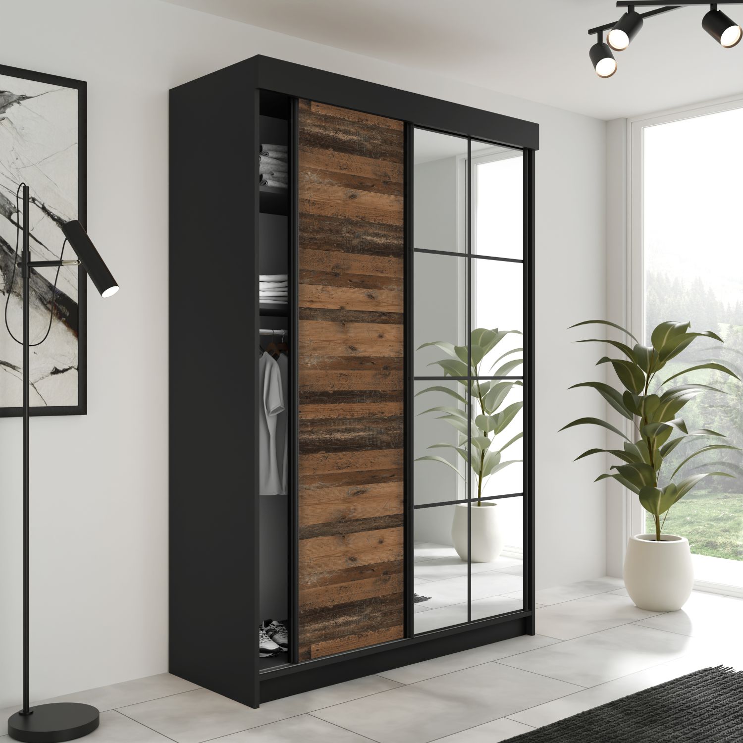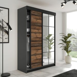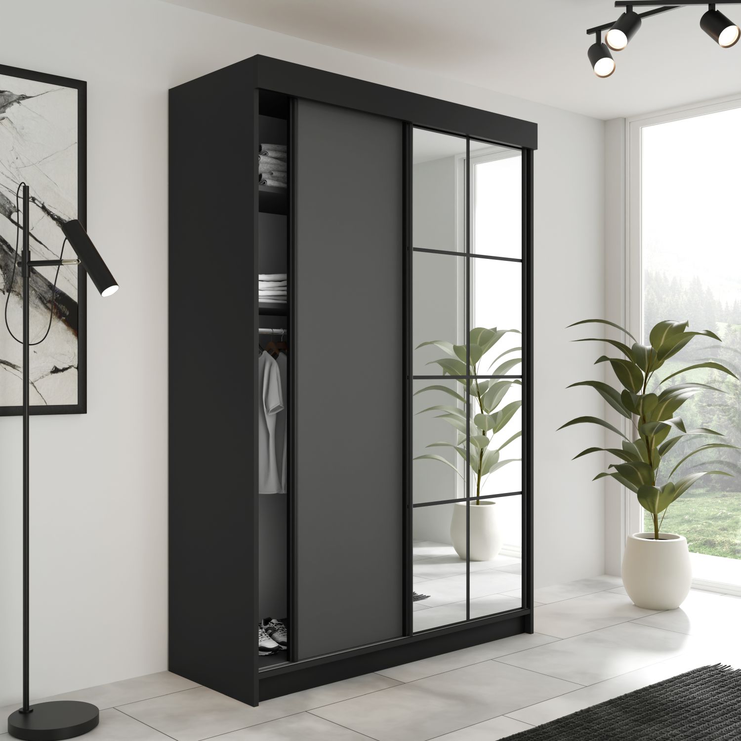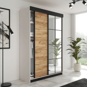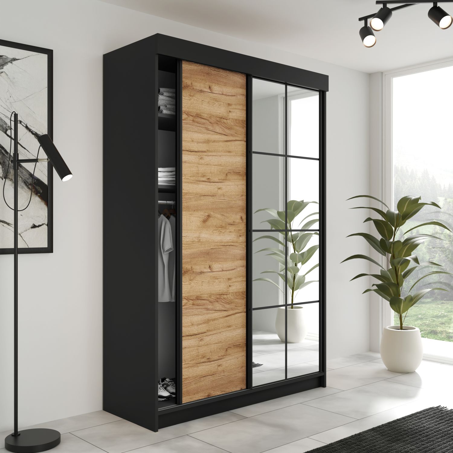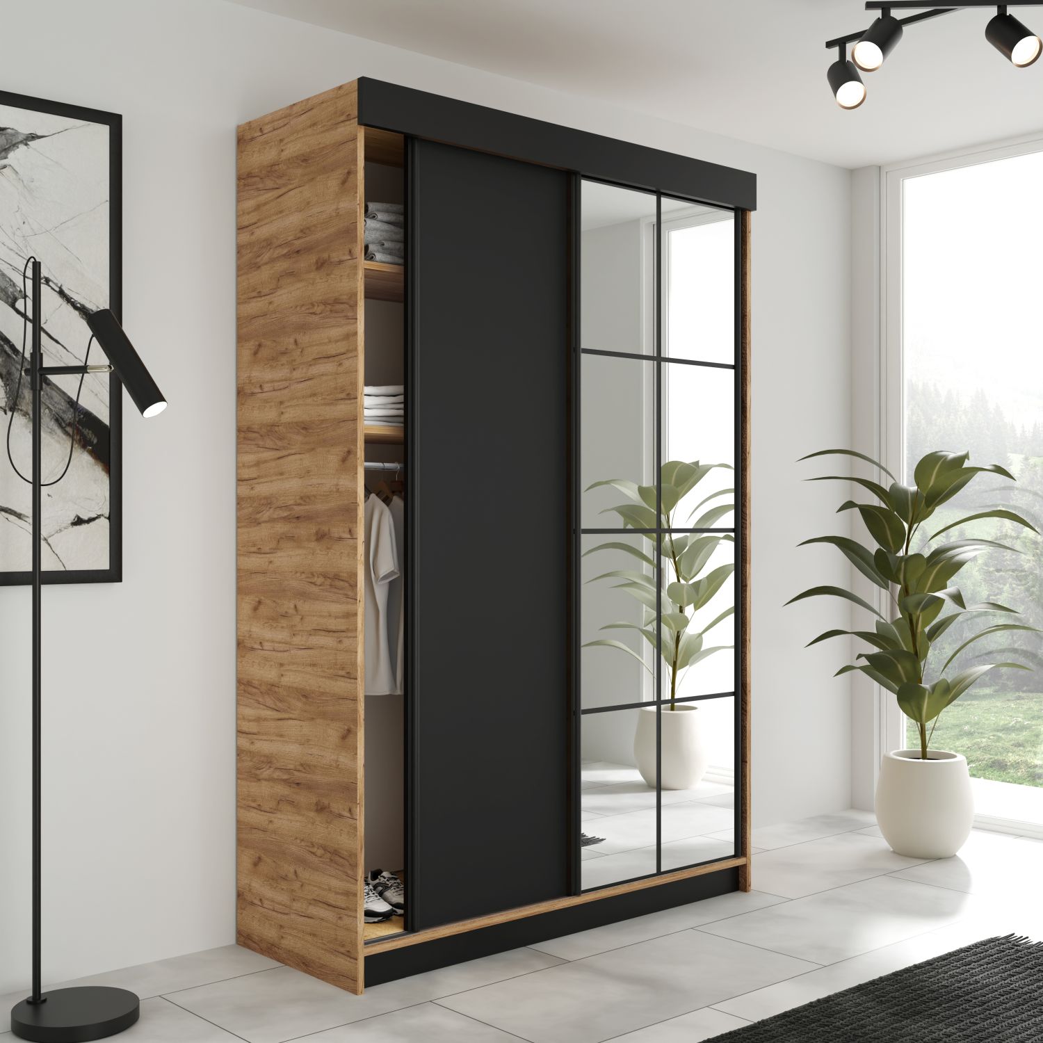 Szafa przesuwna ALVARO 138 cm z lustrem to nowoczesny i praktyczny mebel, idealny do sypialni, garderoby lub przedpokoju. Cechuje ją elegancki design z kontrastowym wykończeniem oraz funkcjonalne rozwiązania, które ułatwiają organizację przestrzeni.Model wyposażony jest w drzwi przesuwne, dzięki czemu doskonale sprawdza się nawet w mniejszych pomieszczeniach. Duże lustro z podziałami w stylu loftowym nadaje całości wyjątkowego charakteru i optycznie powiększa wnętrze. Wnętrze szafy zawiera drążek na ubrania oraz półki, zapewniające wygodne przechowywanie garderoby.