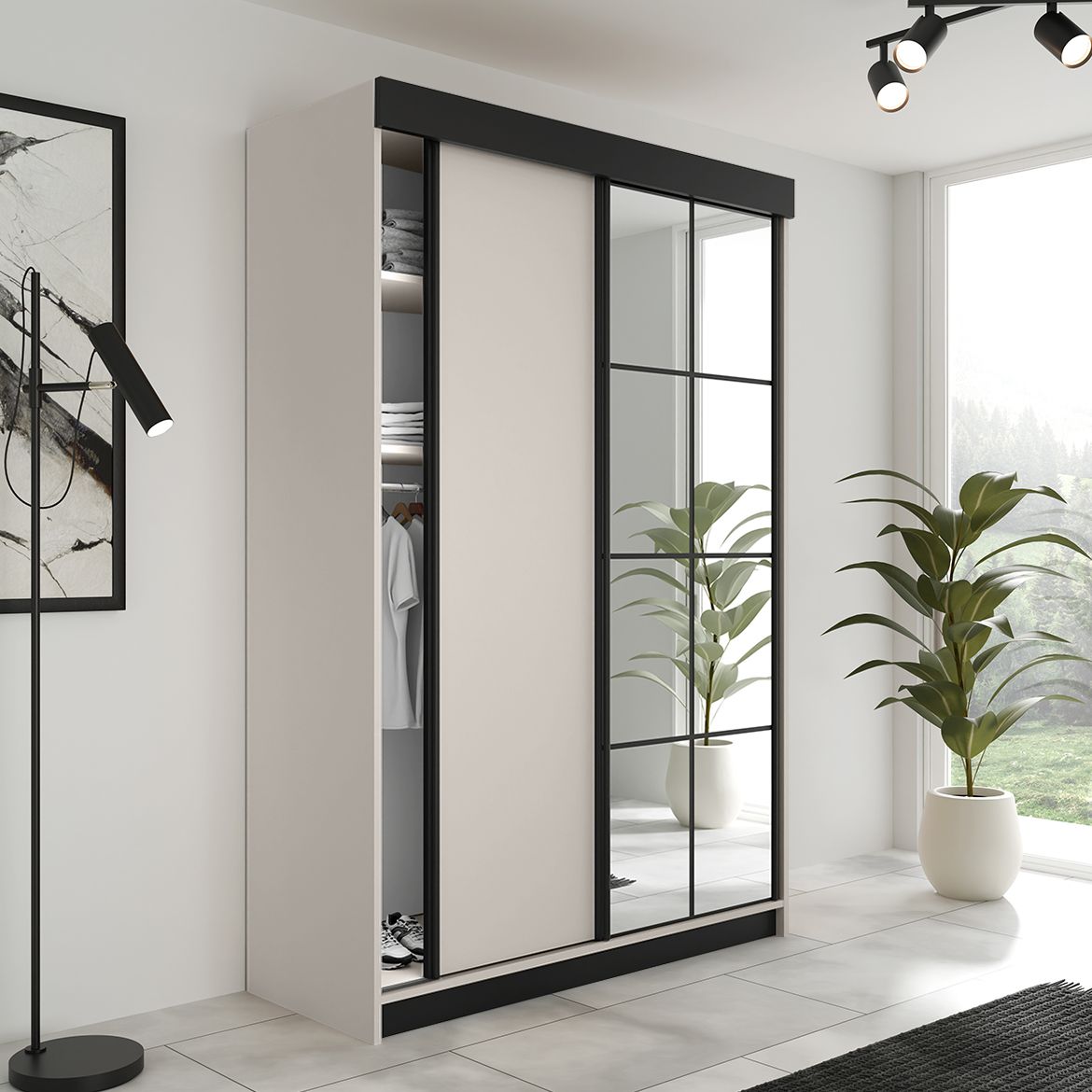 Subtelna elegancja i nowoczesna prostota spotykają się tu w doskonałej równowadze. Geometryczne podziały lustra oraz stonowana forma sprawiają, że mebel staje się nie tylko praktycznym elementem wyposażenia, lecz także ozdobą wnętrza.Szafa dwudrzwiowa ALVARO 167 cm przesuwna z lustrem łączy funkcjonalność z wyrafinowanym stylem. Drzwi przesuwne ułatwiają korzystanie z szafy nawet w mniejszych pomieszczeniach, a duże lustro w stylu loftowym optycznie powiększa przestrzeń. Wnętrze mebla kryje drążek na ubrania i pojemne półki, zapewniające doskonałą organizację garderoby.