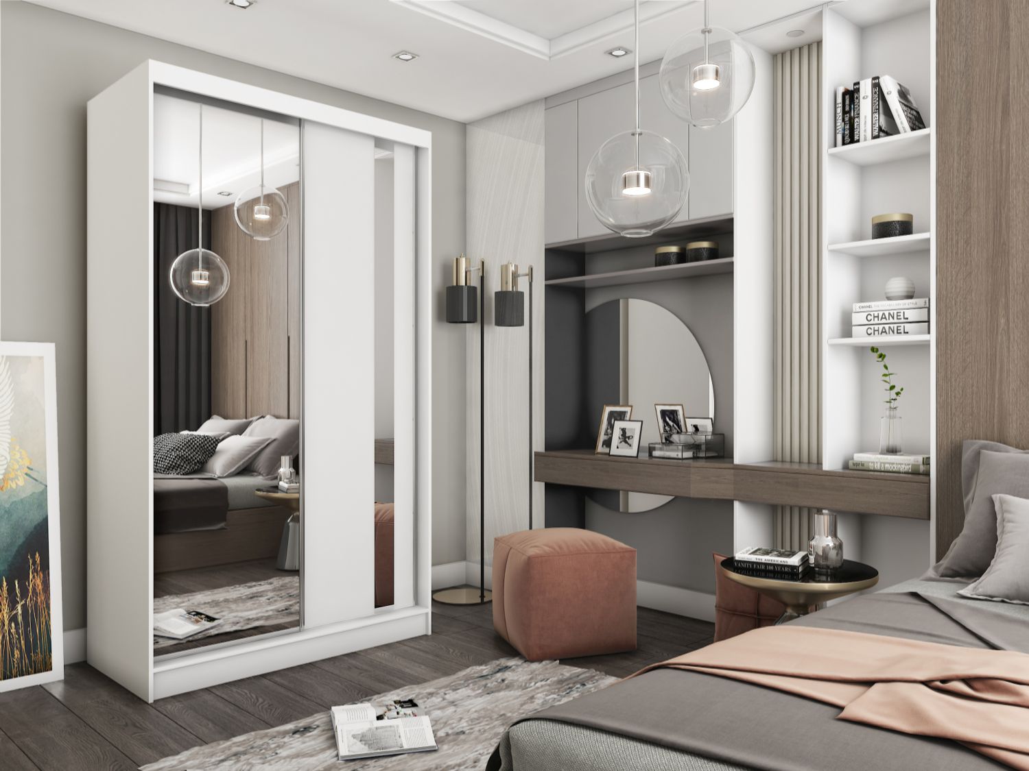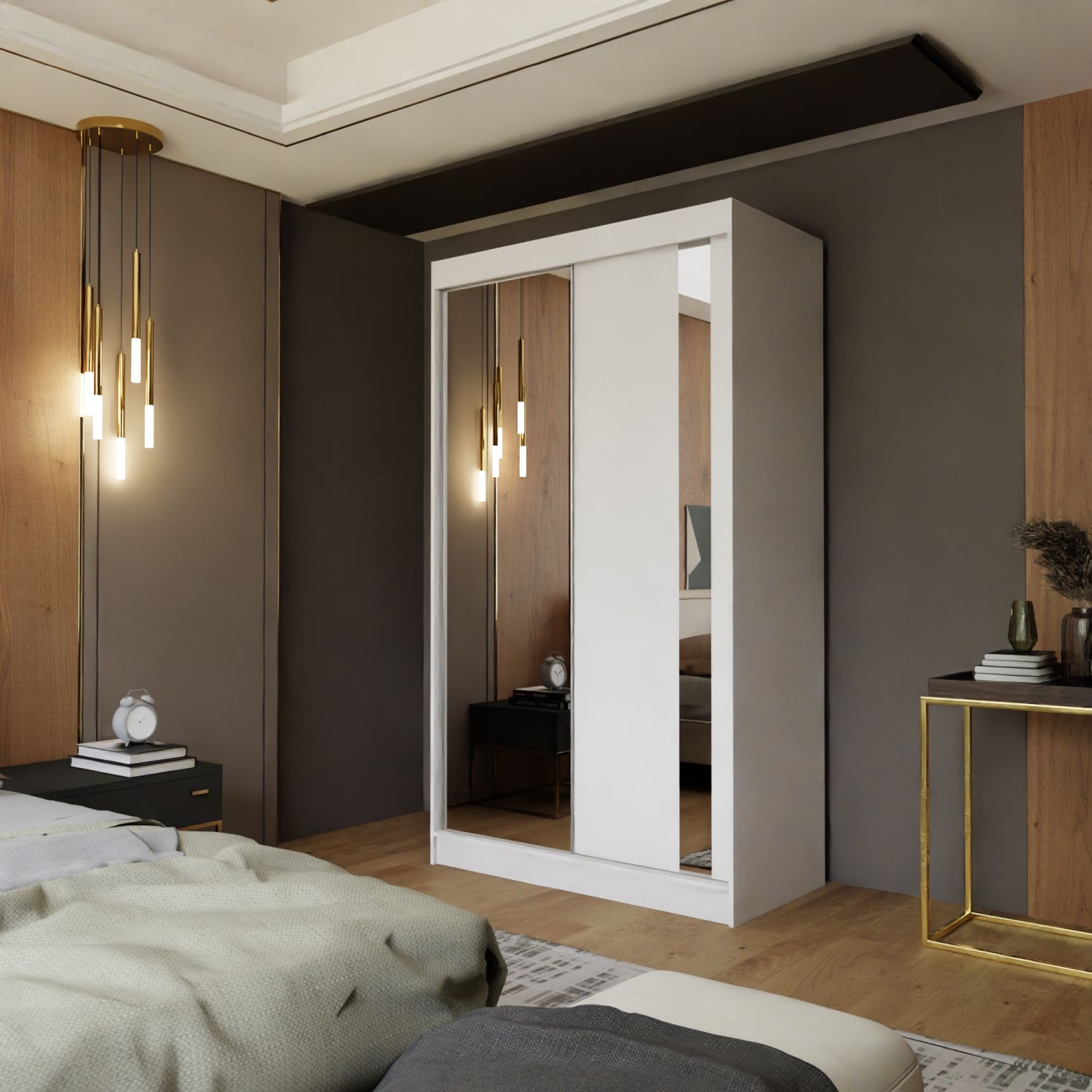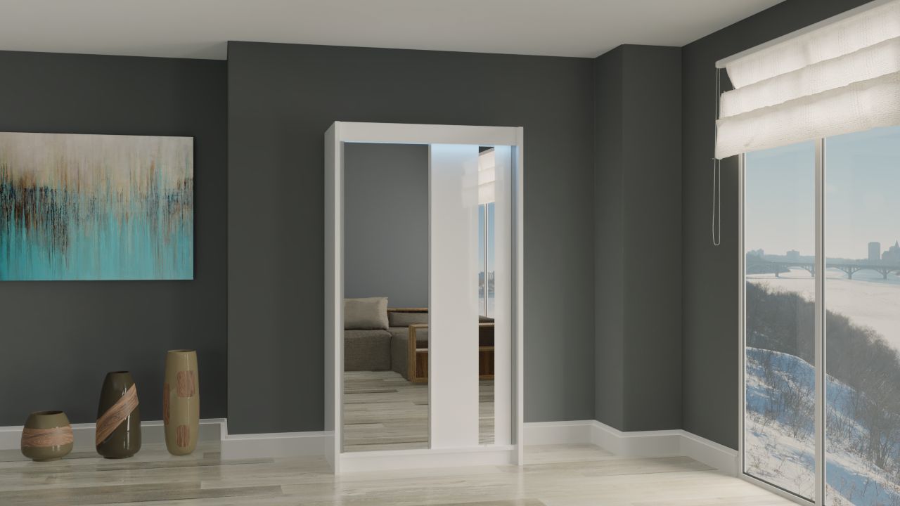 Szafa przesuwna ARLENA 120 PLUS z dwiema szufladami, lustrem i pionową wstawką lustrzaną biały