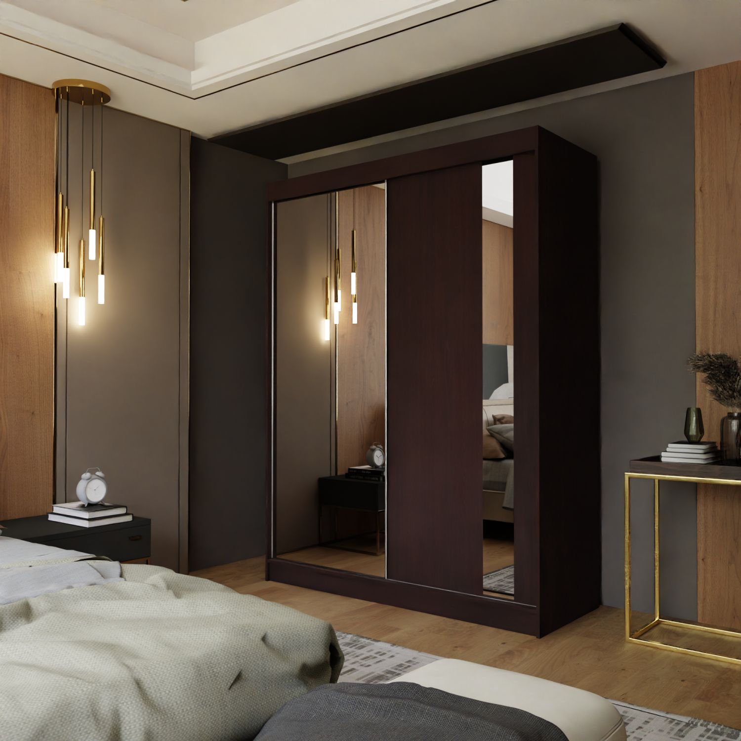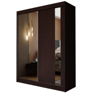 Szafa dwudrzwiowa ARLENA 150 z lustrem i pionową wstawką lustrzaną wenge to elegancka propozycja dla osób ceniących klasyczny styl w nowoczesnym wydaniu. Ciemny odcień wenge nadaje wnętrzu głębi i wyrafinowanego charakteru, idealnie komponując się z różnymi aranżacjami.