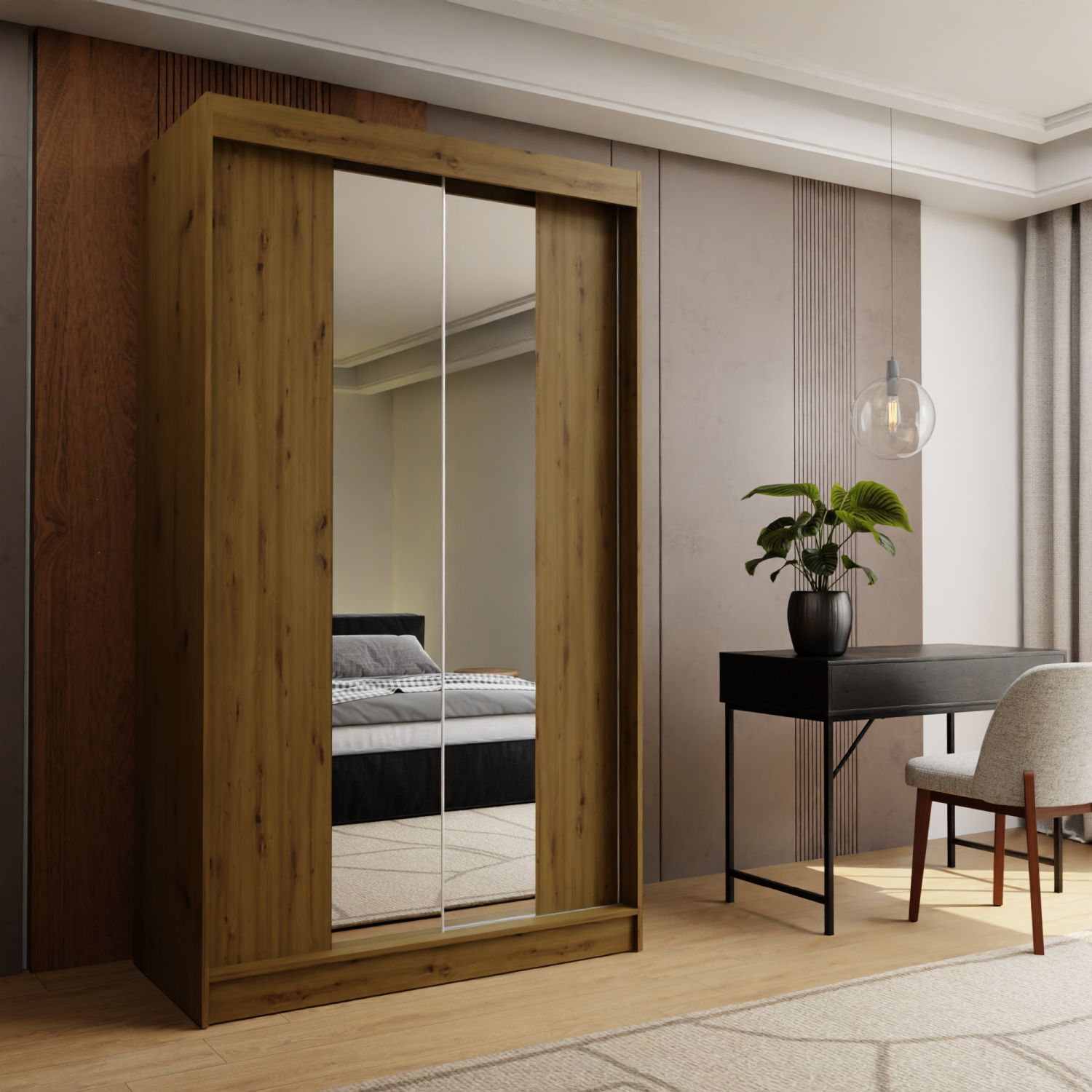 Szafa ARMONA w wybarwieniu dąb artisan łączy naturalny wygląd z funkcjonalnym wnętrzem, stanowiąc doskonały wybór do eleganckich, współczesnych sypialni.