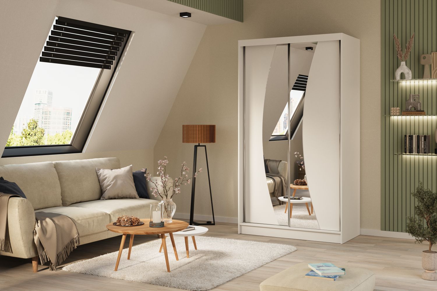 Szafa przesuwna CLARISSE 120 PLUS z dwiema szufladami i dwoma lustrami w kształcie fali biały