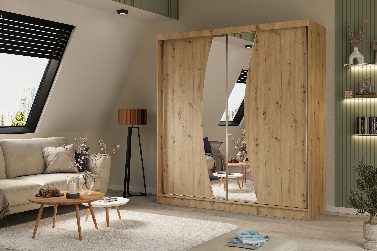 Szafa przesuwna CLARISSE 200 z dwoma lustrami w kształcie fali dąb artisan