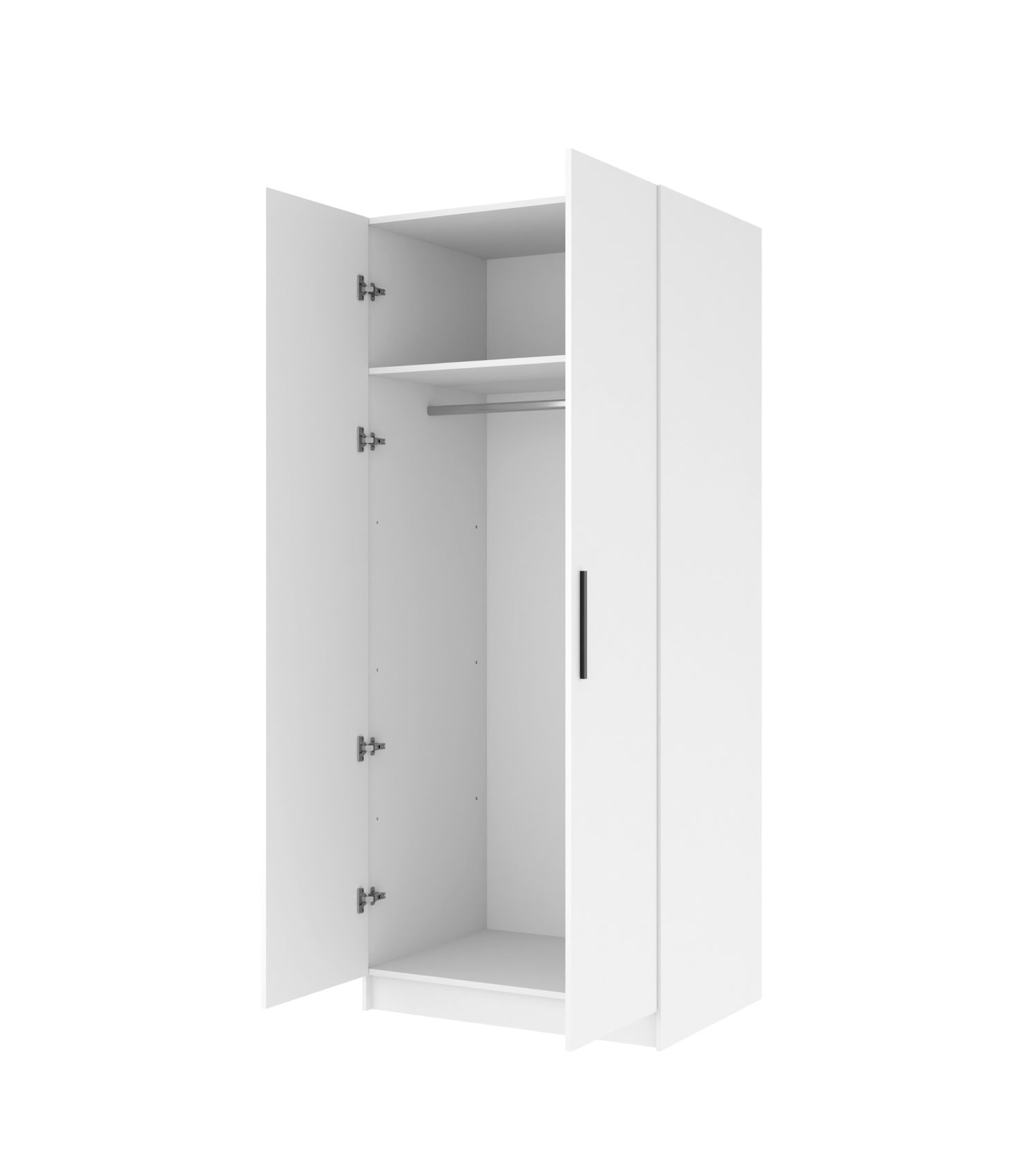 Trwałe zawiasy i solidne uchwyty zapewniają płynne otwieranie, a pełen dostęp do wnętrza szafy ułatwia organizację przechowywanych rzeczy.