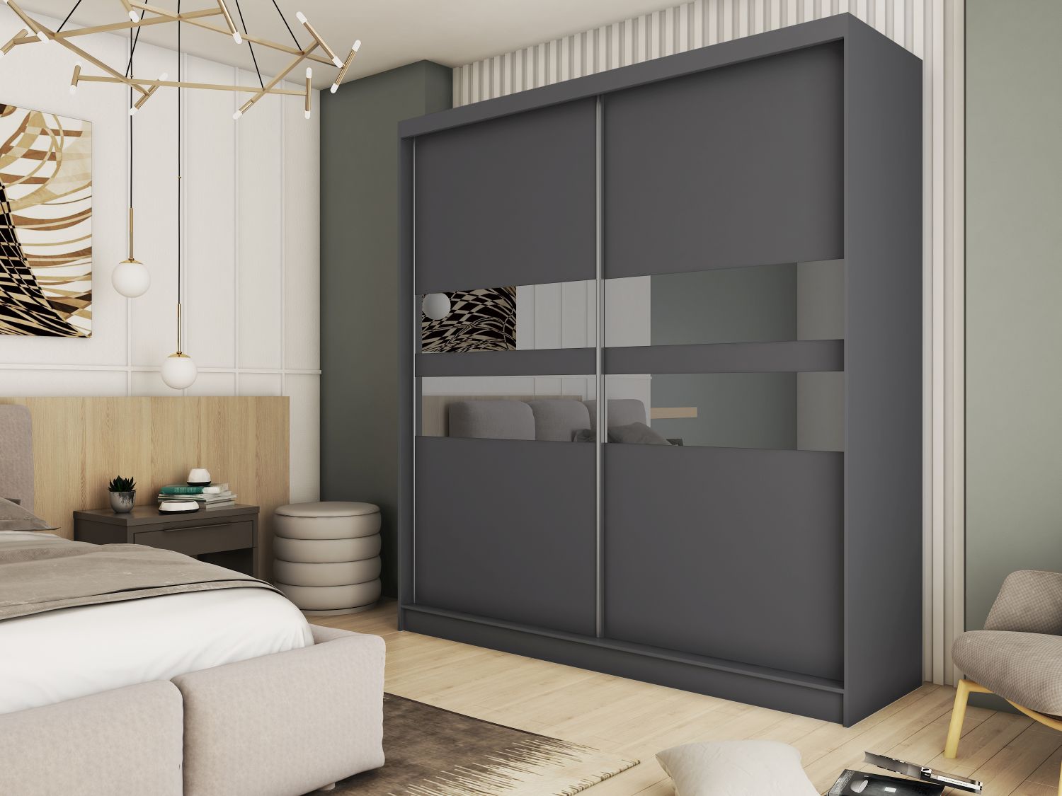 Szafa EVANORA w kolorze grafitowy szary łączy nowoczesny design z funkcjonalnym wnętrzem, stanowiąc elegancki wybór do stylowych, współczesnych wnętrz.