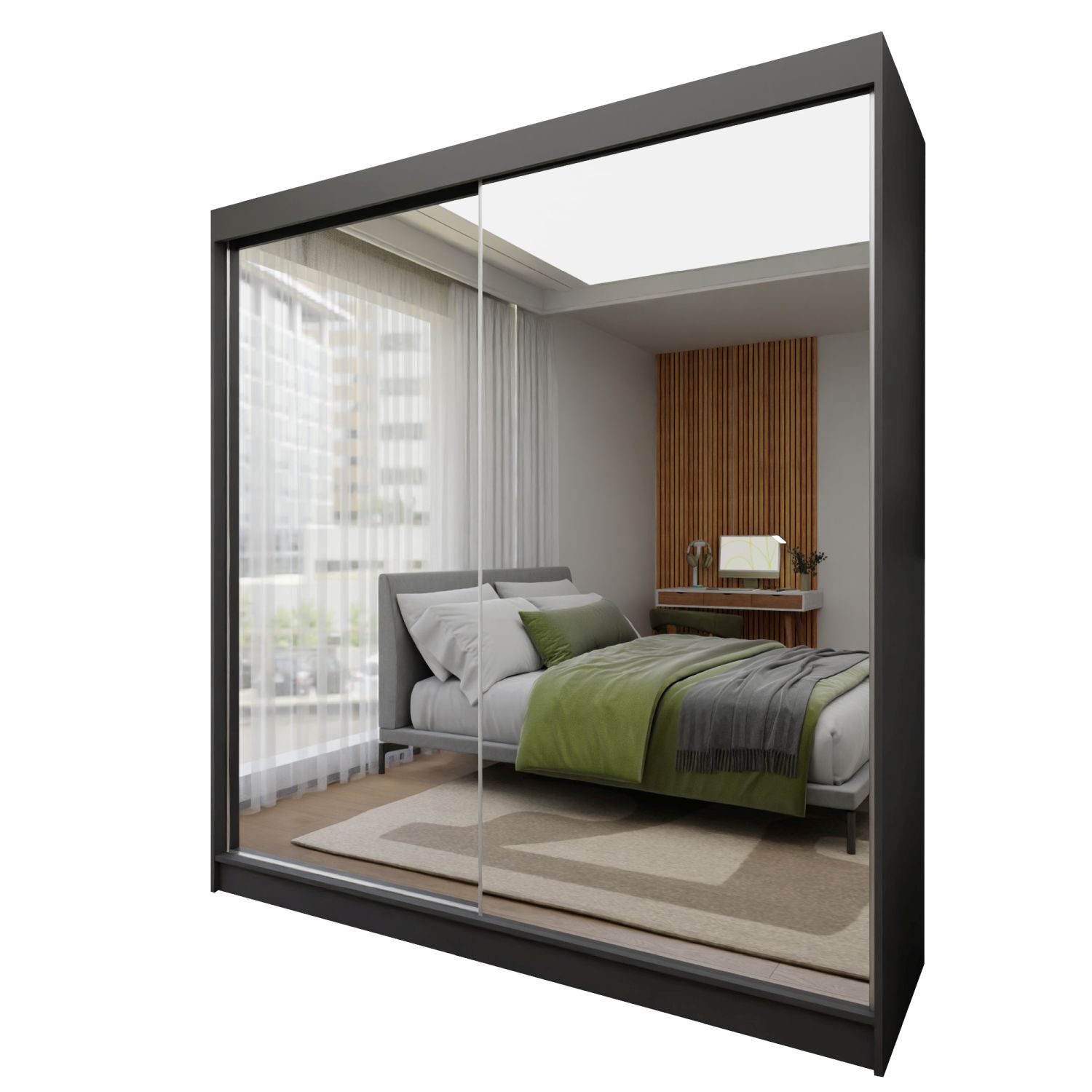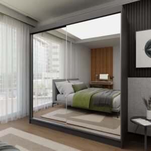 Nowoczesna elegancja i stonowany charakter wyróżniają kolekcję FIORINA, w której prosta forma została połączona z eleganckim wykończeniem w kolorze grafitowy szary. Głęboki odcień nadaje wnętrzu stylowego wyglądu, a podwójne lustra na froncie optycznie powiększają przestrzeń, wprowadzając do niej światło i harmonię.Szafa przesuwna FIORINA 200 PLUS została zaprojektowana z myślą o estetyce i funkcjonalności. Wyposażono ją w cztery pojemne szuflady, praktyczne półki oraz drążek na ubrania, co zapewnia funkcjonalne wnętrze idealne do codziennego użytkowania. System przesuwny gwarantuje płynne i ciche otwieranie, a solidna konstrukcja wykonana z trwałych materiałów zapewnia stabilność i niezawodność przez lata.
