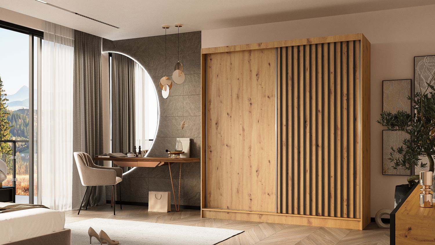 Szafa ILARIA w wybarwieniu dąb artisan łączy naturalny wygląd i praktyczność, stanowiąc doskonały wybór do nowoczesnych, eleganckich wnętrz.