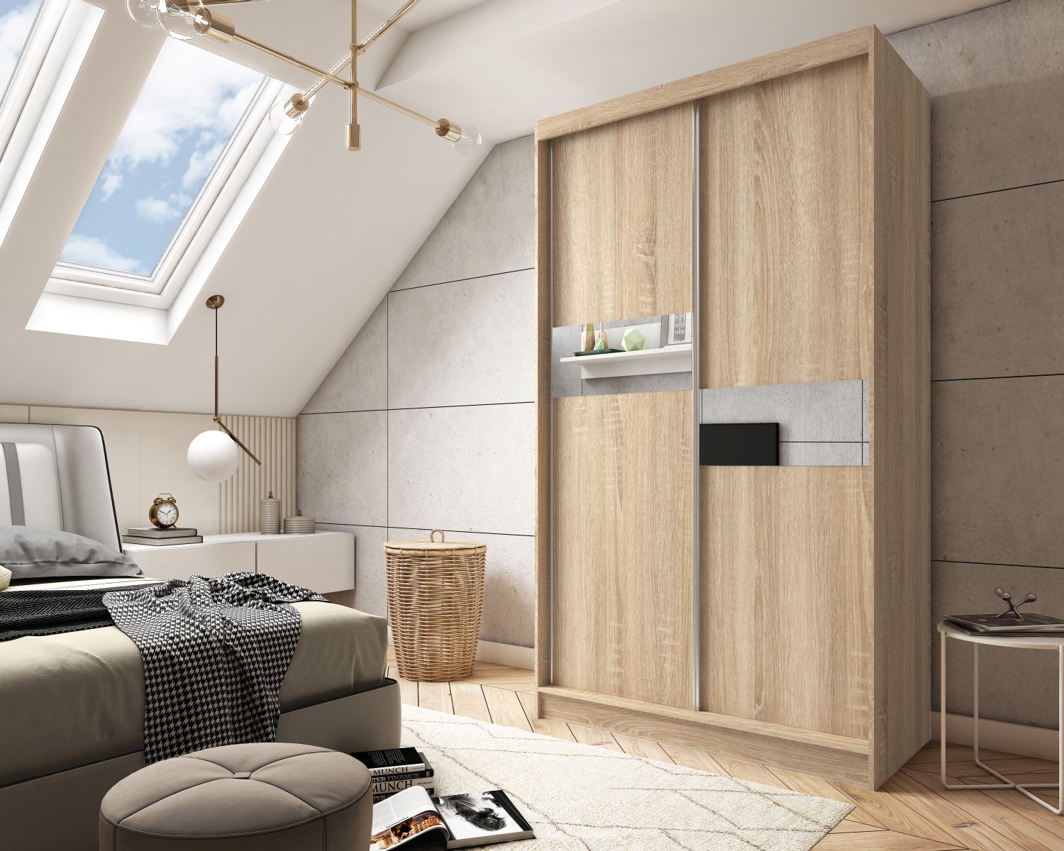 Szafa ISADORA w wybarwieniu dąb sonoma łączy naturalny wygląd z funkcjonalnym wnętrzem, stanowiąc doskonały wybór do przytulnych, eleganckich sypialni.