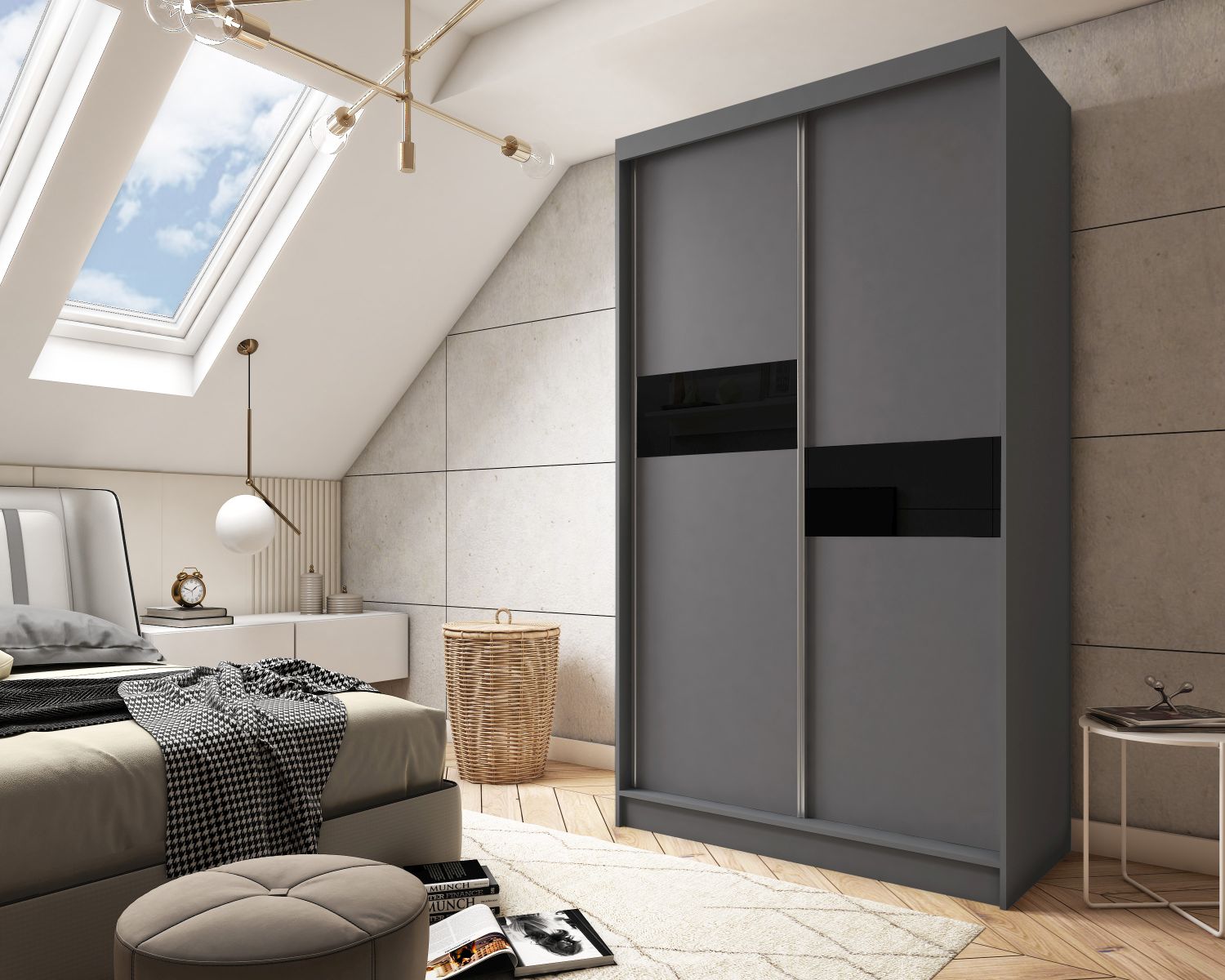 Szafa ISADORA w kolorze grafitowy szary łączy nowoczesny wygląd z praktycznym wnętrzem, stanowiąc idealny wybór do eleganckich, współczesnych sypialni.