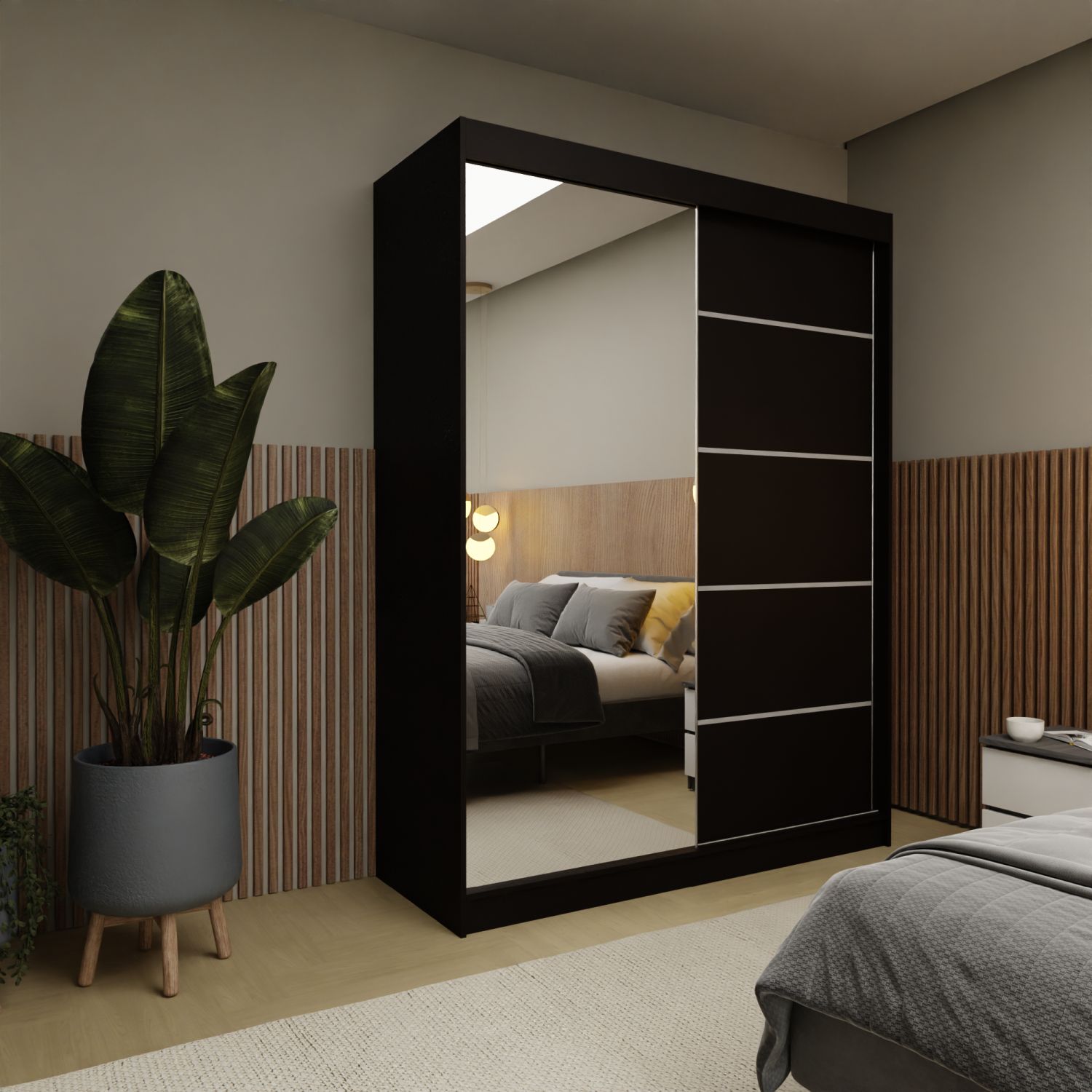 Szafa przesuwna MELIORA 150 z lustrem i listwami dekoracyjnymi czarny Szafa przesuwna MELIORA 150 z lustrem i listwami dekoracyjnymi czarny