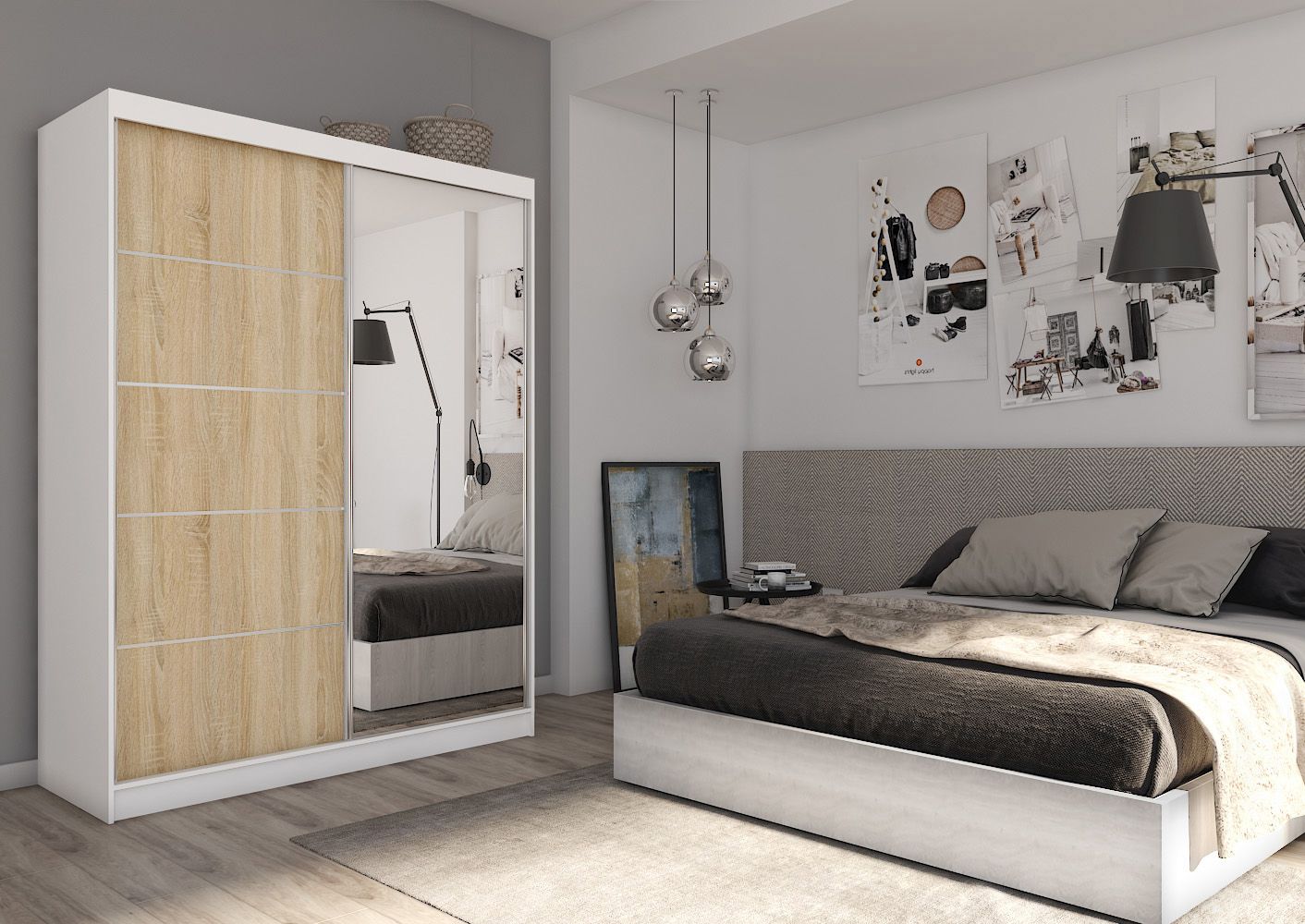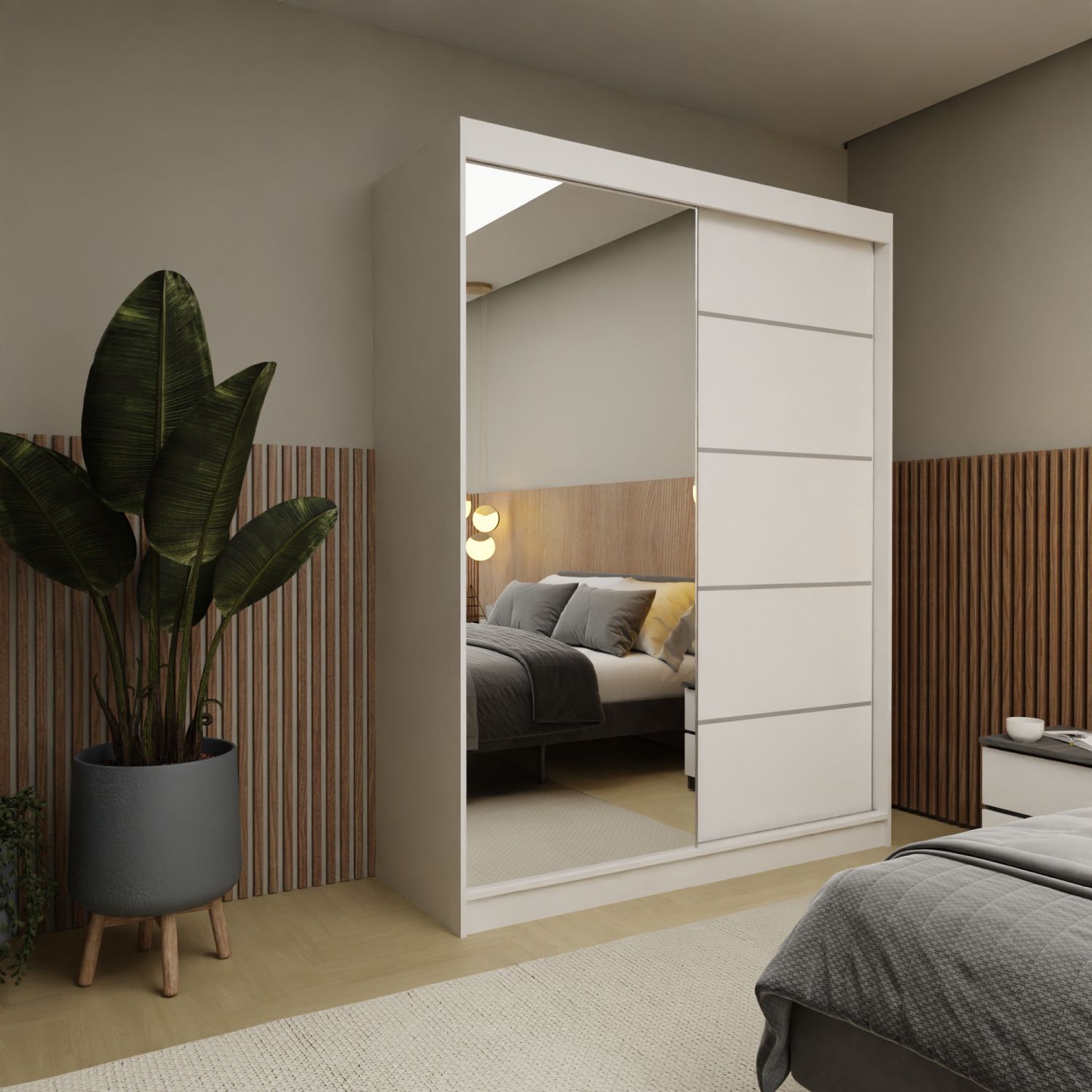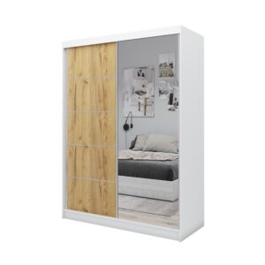 Szafa MELIORA 160 w kolorze białym to elegancki mebel, który wnosi do wnętrza świeżość, lekkość i nowoczesny charakter. Jasne wykończenie optycznie powiększa przestrzeń, dzięki czemu szafa doskonale sprawdzi się zarówno w większych, jak i mniejszych pomieszczeniach.Front zdobi duże lustro oraz subtelne listwy dekoracyjne, które nadają całości wyrafinowanego wyglądu. Wnętrze mebla wyposażono w drążek na ubrania oraz pojemne półki, umożliwiające praktyczne przechowywanie garderoby. Drzwi przesuwne zapewniają komfort użytkowania, a solidna konstrukcja z trwałych materiałów gwarantuje stabilność i długowieczne użytkowanie.