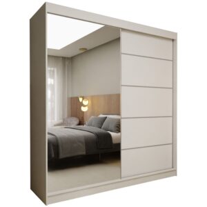 Szafa dwudrzwiowa MELIORA 200 została wyposażona w duże lustro oraz listwy dekoracyjne w kolorze białym, które podkreślają jej lekkość i nowoczesny charakter. Wnętrze szafy tworzy funkcjonalny układ półek i drążek na ubrania, zapewniający wygodę przechowywania i porządek na co dzień.