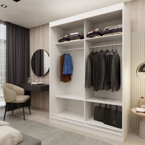 Szafa ORNELLA w kolorze białym łączy funkcjonalność i elegancki wygląd, stanowiąc doskonały wybór do jasnych, nowoczesnych wnętrz.