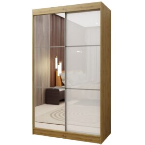 Szafa dwudrzwiowa SERENA 120 została wyposażona w panel szklany oraz listwy dekoracyjne w wybarwieniu dąb artisan, które podkreślają jej elegancki i naturalny wygląd. Przemyślane wnętrze z półkami i drążkiem na ubrania gwarantuje wygodne przechowywanie oraz funkcjonalność w codziennym użytkowaniu.