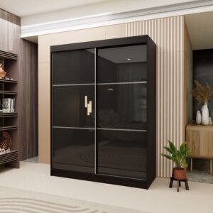 Szafa SERENA w kolorze czarnym łączy nowoczesny design z funkcjonalnym wnętrzem, stanowiąc elegancki wybór do stylowych, współczesnych sypialni.