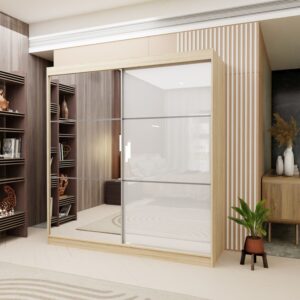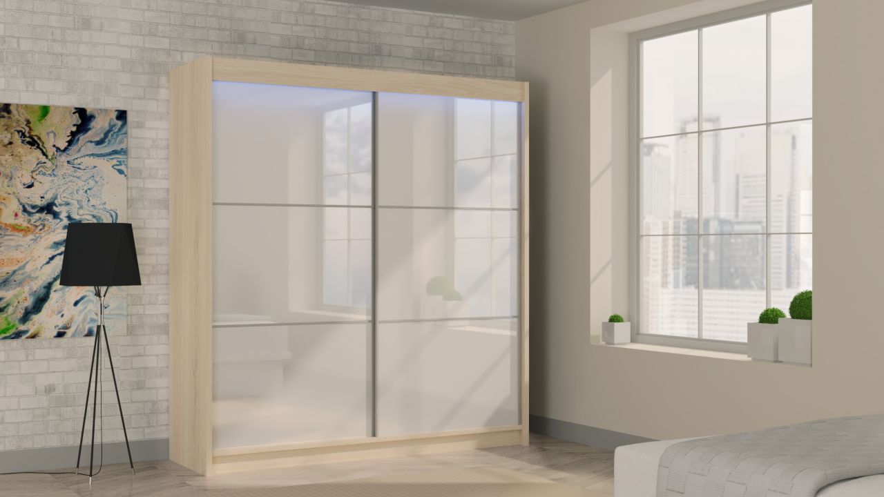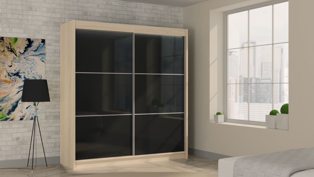 Szafa przesuwna SERENA 200 PLUS z czteroma szufladami, panelem szklanym i listwami dekoracyjnymi dąb sonoma