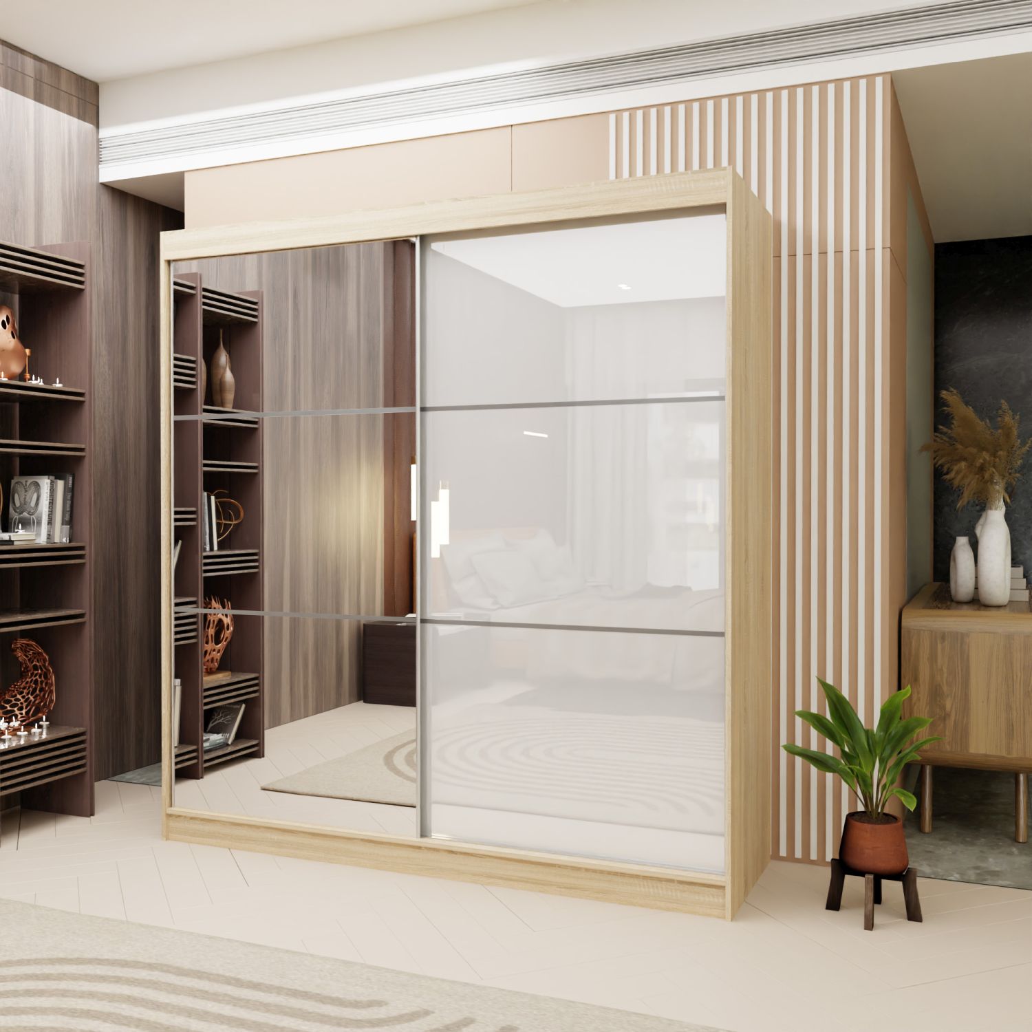 Szafa SERENA w wybarwieniu dąb sonoma łączy nowoczesny design z praktycznym wnętrzem, stanowiąc idealny wybór do jasnych i eleganckich sypialni.