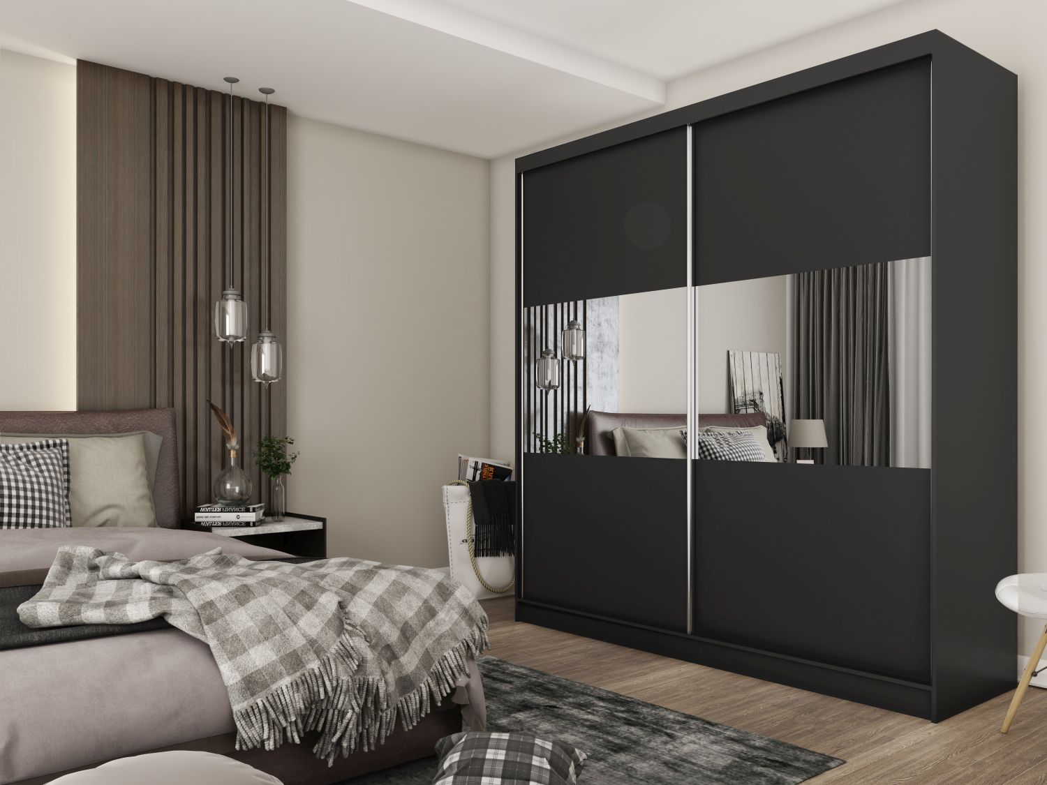Szafa VERONYA w kolorze czarnym łączy nowoczesny design z praktycznym wnętrzem, stanowiąc doskonały wybór do eleganckich, współczesnych sypialni.