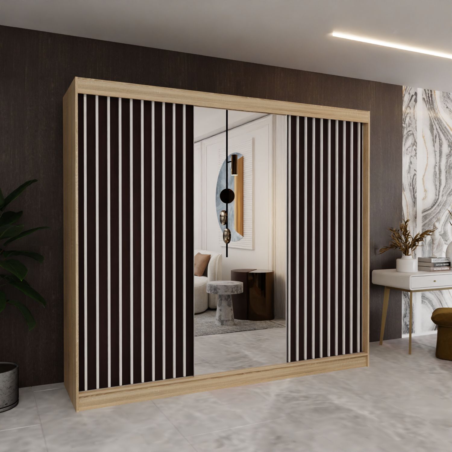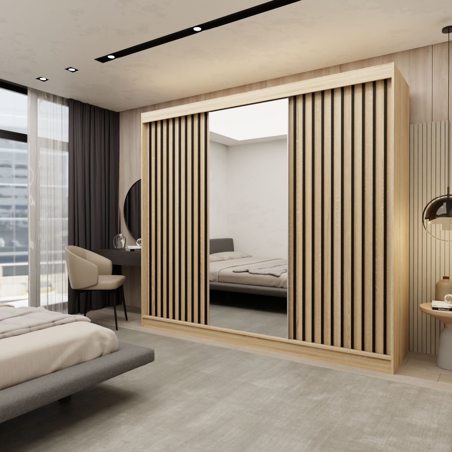 Szafa przesuwna ALMIRA 240 z lustrem i lamelami dąb sonoma