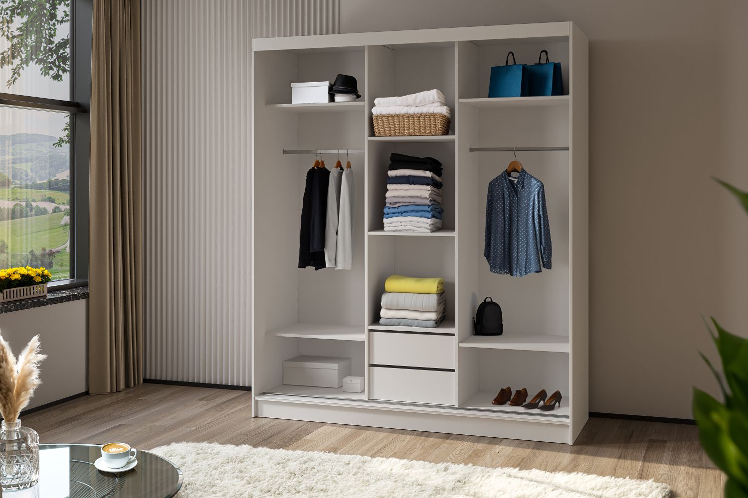Nowoczesna elegancja i wyważony styl wyróżniają kolekcję CLARISSE, w której funkcjonalność łączy się z dekoracyjnym charakterem. Stonowane wykończenie w kolorze grafitowy szary nadaje meblowi wyrafinowanego wyglądu, a lustra w kształcie fali stanowią oryginalny akcent podkreślający jego wyjątkowy design.Szafa przesuwna CLARISSE 180 została wyposażona w trzy lustra, z czego dwa mają falisty kształt, co dodaje całości lekkości i optycznie powiększa przestrzeń. Dwie pojemne szuflady zapewniają praktyczne miejsce do przechowywania, a wnętrze z półkami i drążkami na ubrania gwarantuje maksymalną funkcjonalność i komfort użytkowania.