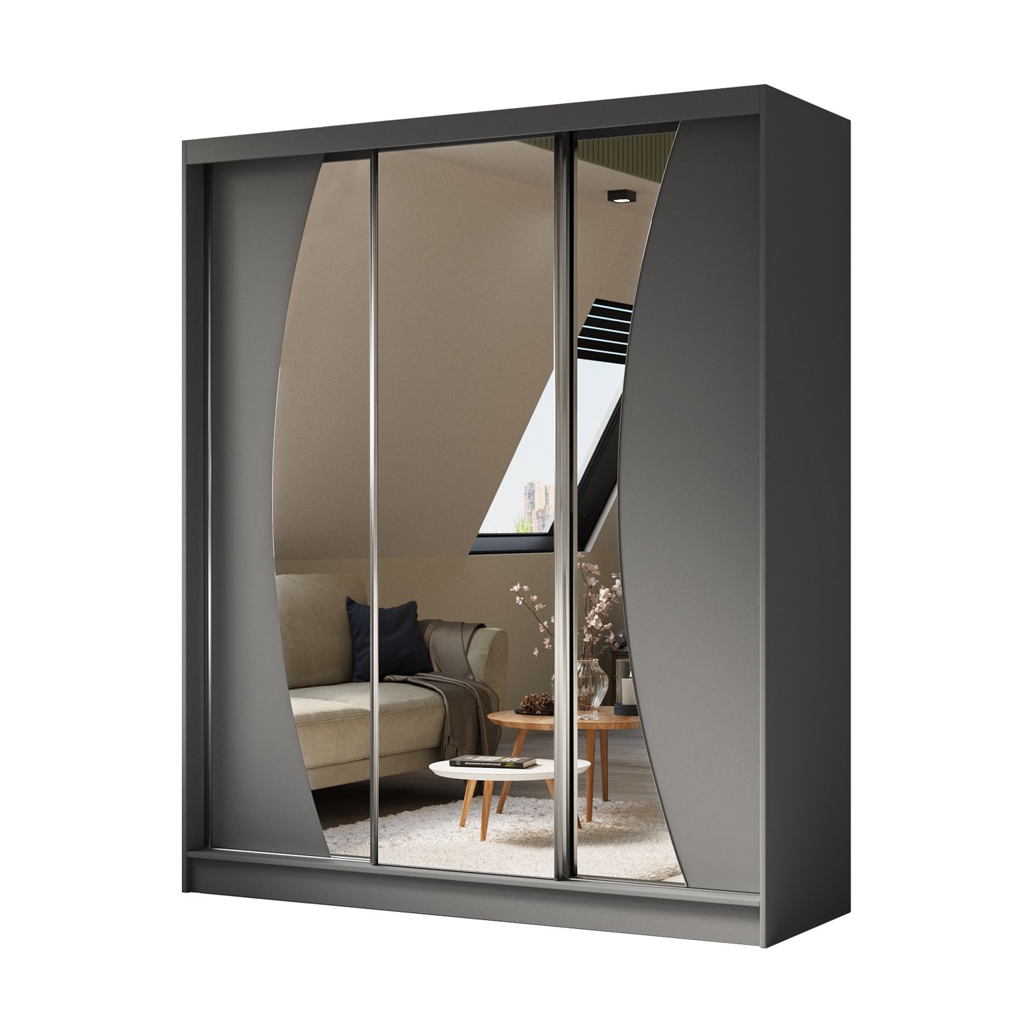 Szafa przesuwna CLARISSE 180 z dwiema szufladami i trzema lustrami, w tym dwa w kształcie fali grafitowy szary Szafa przesuwna CLARISSE 180 z dwiema szufladami i trzema lustrami, w tym dwa w kształcie fali grafitowy szary