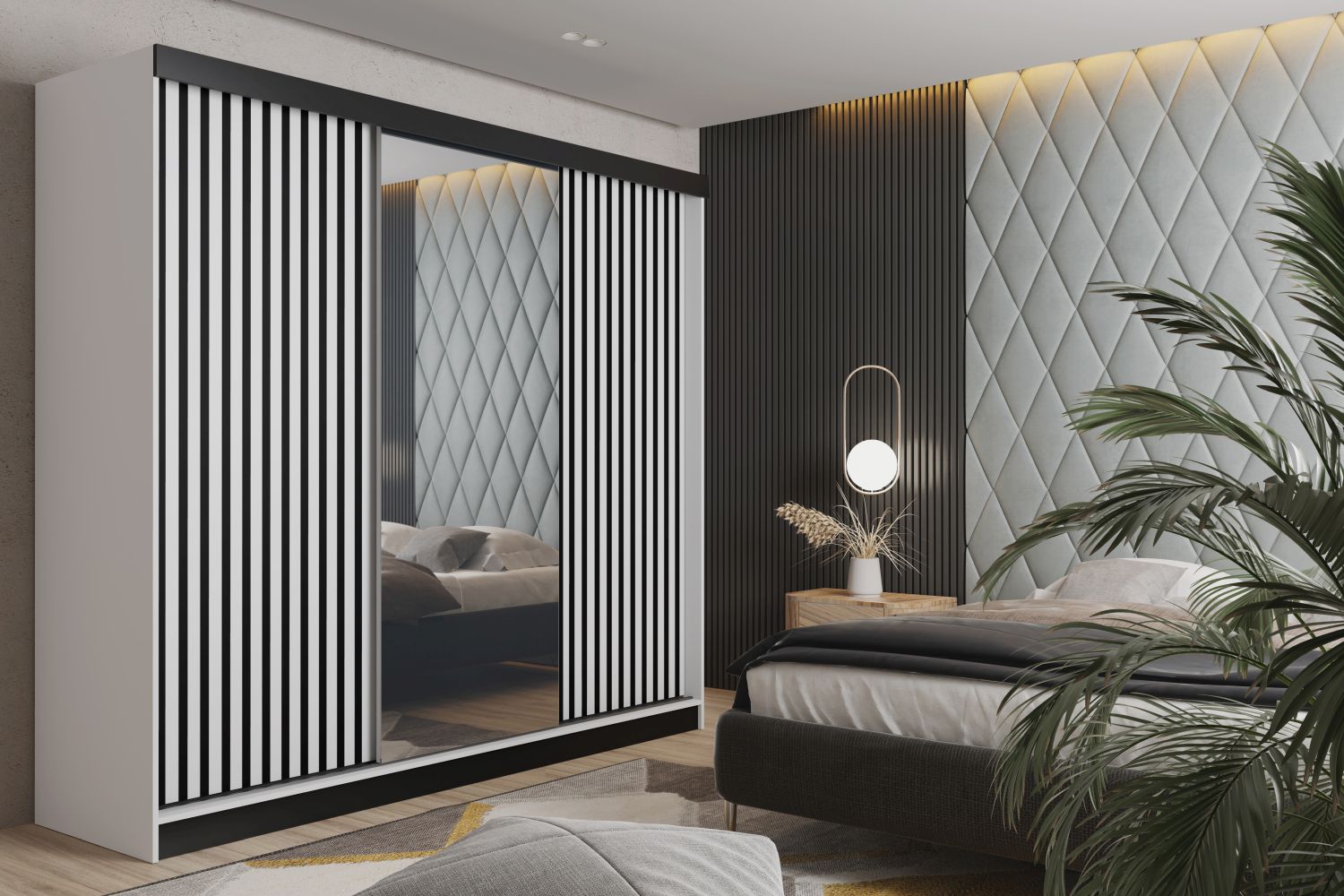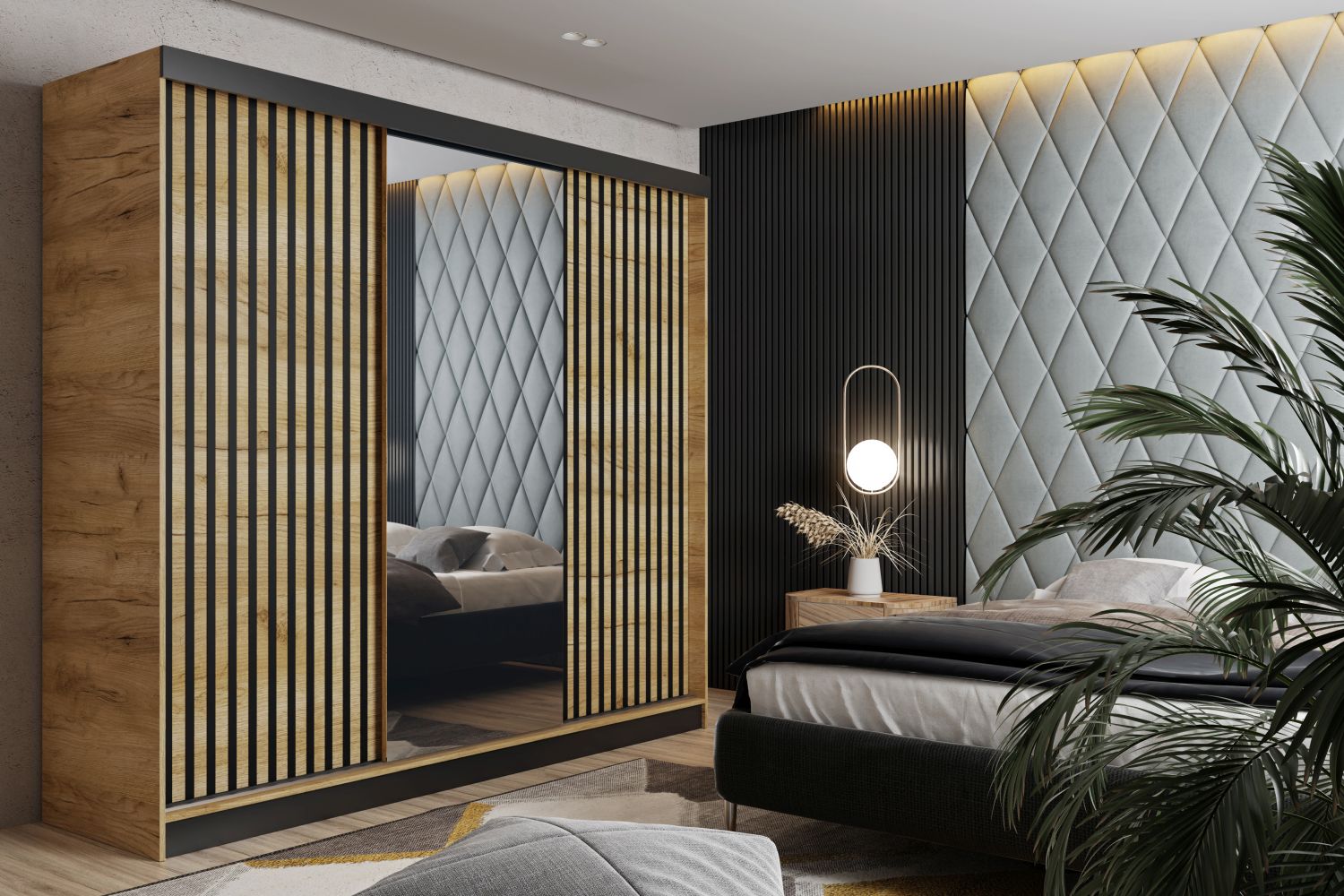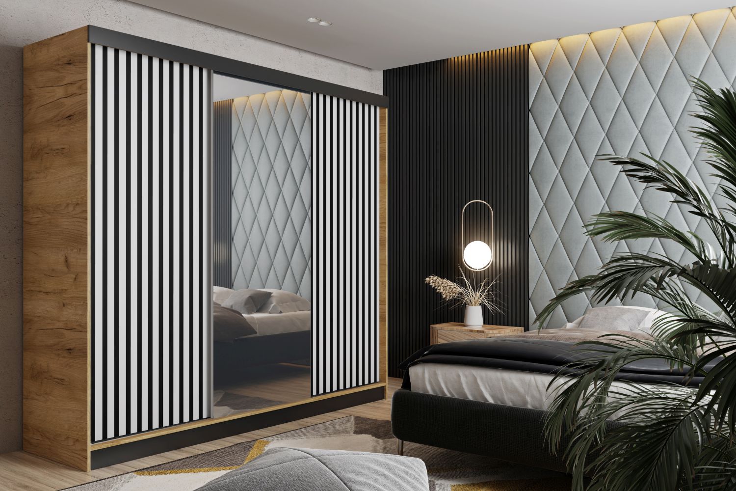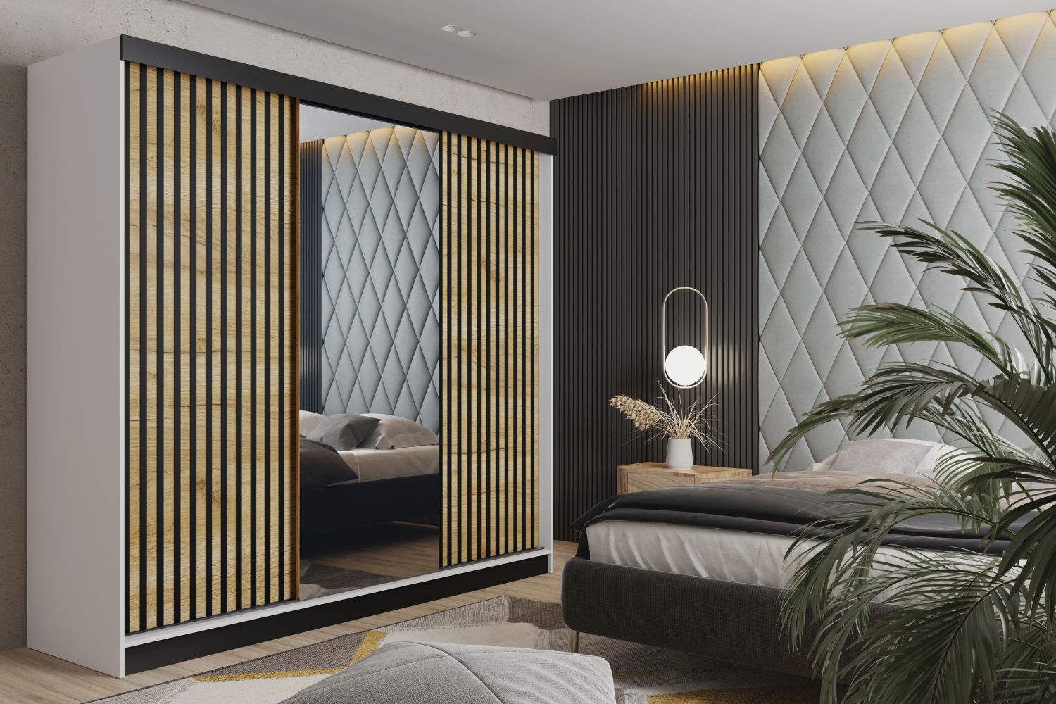 Luksusowy porządek na dużą skalę – trzydrzwiowa szafa MALIBU 250 cm z lustrem, przesuwnymi drzwiami i ozdobnymi lamelami to propozycja dla osób, które chcą zmaksymalizować przestrzeń i jednocześnie nadać wnętrzu ekskluzywny charakter. Idealna do przestronnej sypialni, garderoby lub holu.Trzy synchronicznie przesuwne drzwi nie wymagają dodatkowego miejsca, a duże lustro optycznie powiększa i rozjaśnia wnętrze. Lamelowe fronty dodają nowoczesnego, loftowego akcentu, a w środku czeka praktyczny układ: górna półka na sezonowe rzeczy, pełnowymiarowy drążek na wieszaki oraz dodatkowe półki na buty i akcesoria – wszystko, by zachować porządek i łatwo posegregować garderobę.