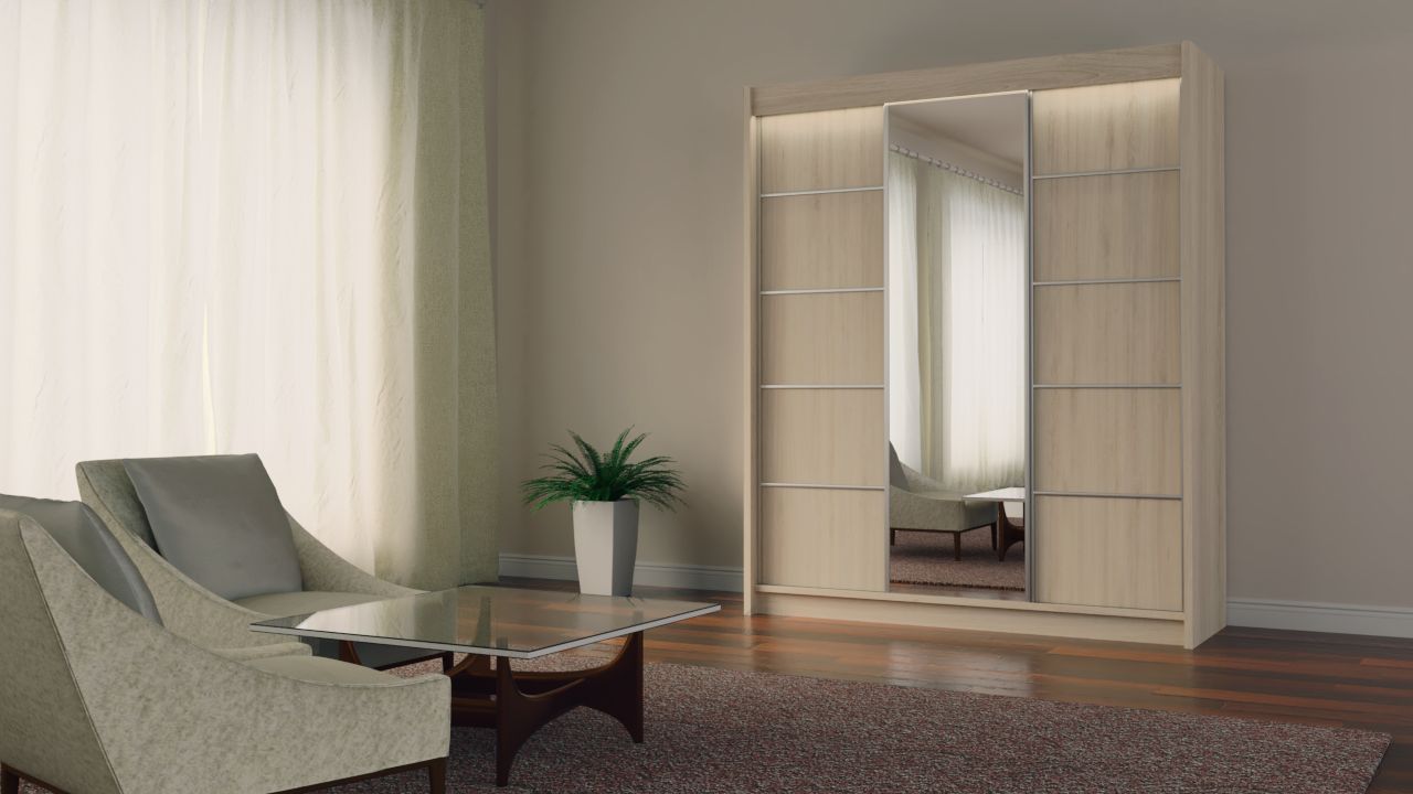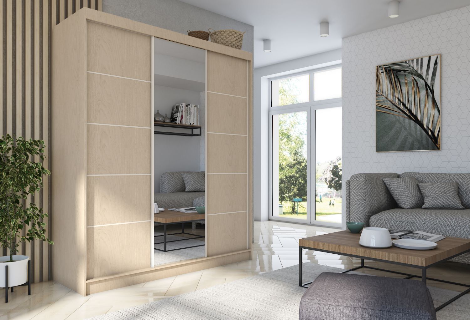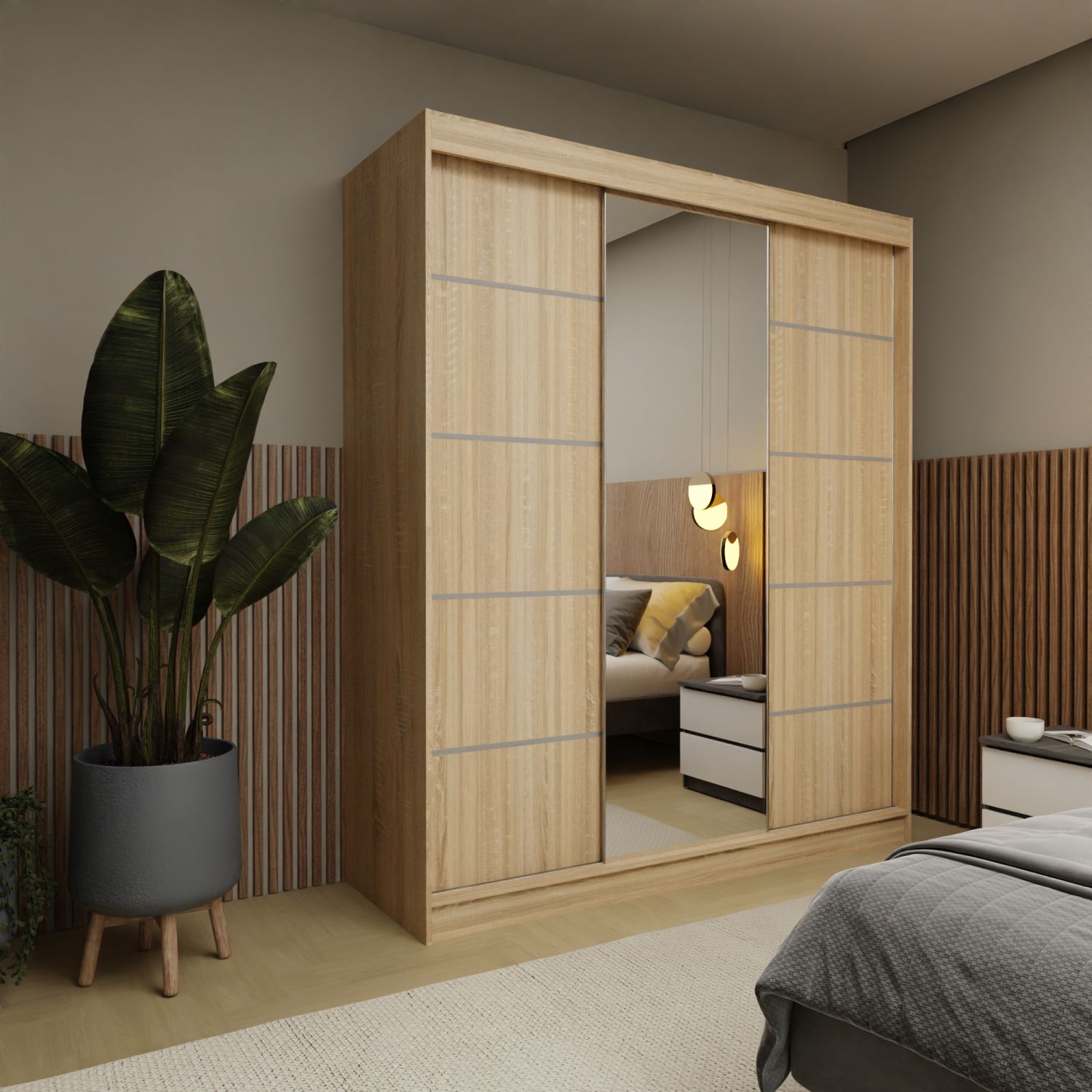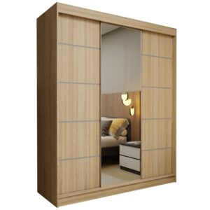 Szafa przesuwna MELIORA 180 z dwiema szufladami, lustrem i listwami dekoracyjnymi dąb sonoma
