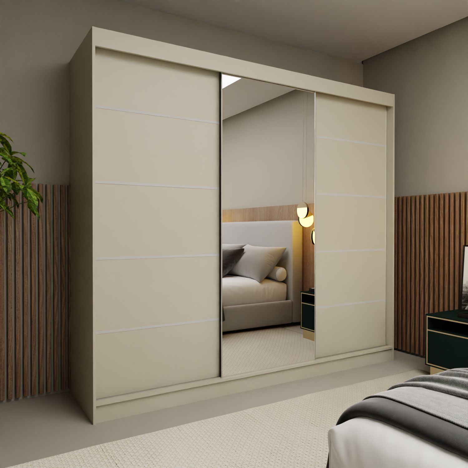 Nowoczesna elegancja i harmonijna forma nadają kolekcji MELIORA wyjątkowego charakteru. Subtelne detale i wyważone proporcje sprawiają, że mebel doskonale wpisuje się w aranżacje współczesnych wnętrz, łącząc estetykę z codzienną funkcjonalnością.Szafa trzydrzwiowa MELIORA 180 została wyposażona w dwie praktyczne szuflady, duże lustro oraz listwy dekoracyjne w odcieniu kaszmir. Przemyślany układ wnętrza obejmuje półki i drążek na ubrania, co pozwala w pełni wykorzystać przestrzeń do przechowywania odzieży i dodatków.