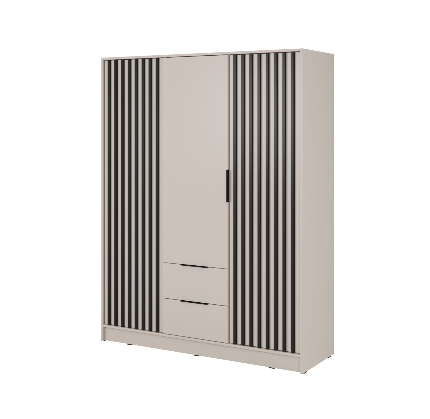 Nowoczesna szafa trzydrzwiowa NOE 155 bez lustra to propozycja dla osób ceniących elegancki design i funkcjonalność w jednym. Charakterystyczne pionowe wstawki lamelowe na frontach nadają jej wyjątkowego stylu, a jednocześnie subtelnie ozdabiają przestrzeń sypialni lub garderoby.Wnętrze szafy zostało zaprojektowane z myślą o praktycznym przechowywaniu – wyposażono je w półki, drążki na ubrania oraz dwie pojemne szuflady umieszczone w dolnej części. Dzięki temu z łatwością utrzymasz porządek i zorganizujesz całą garderobę.