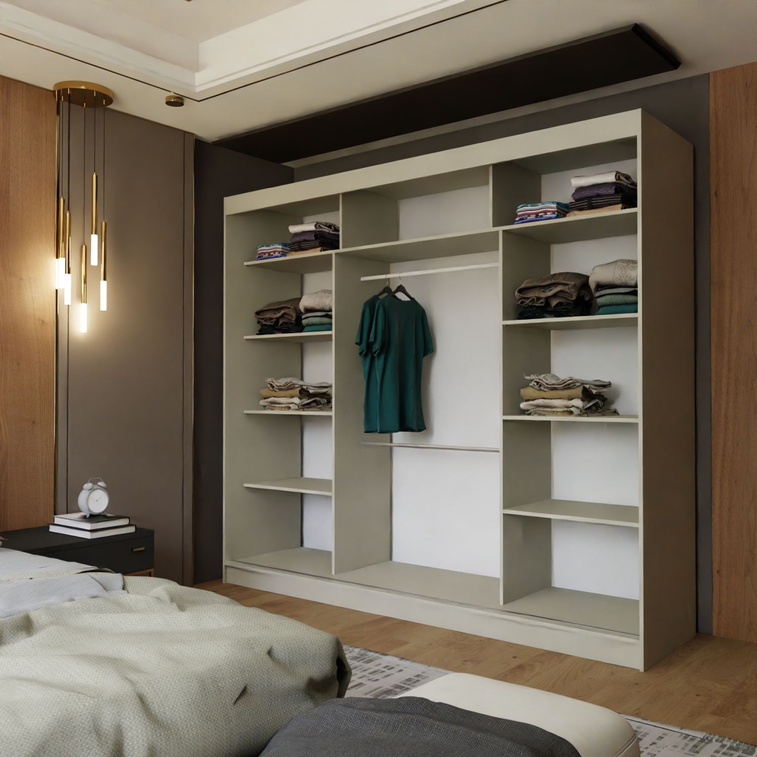 Szafa przesuwna trzydrzwiowa ORNELLA 240 zachwyca minimalistycznym designem i przemyślaną funkcjonalnością. Wyposażona w półki oraz drążki na ubrania, zapewnia optymalną pojemność i wygodę użytkowania, doskonale komponując się z nowoczesnymi, eleganckimi aranżacjami wnętrz.