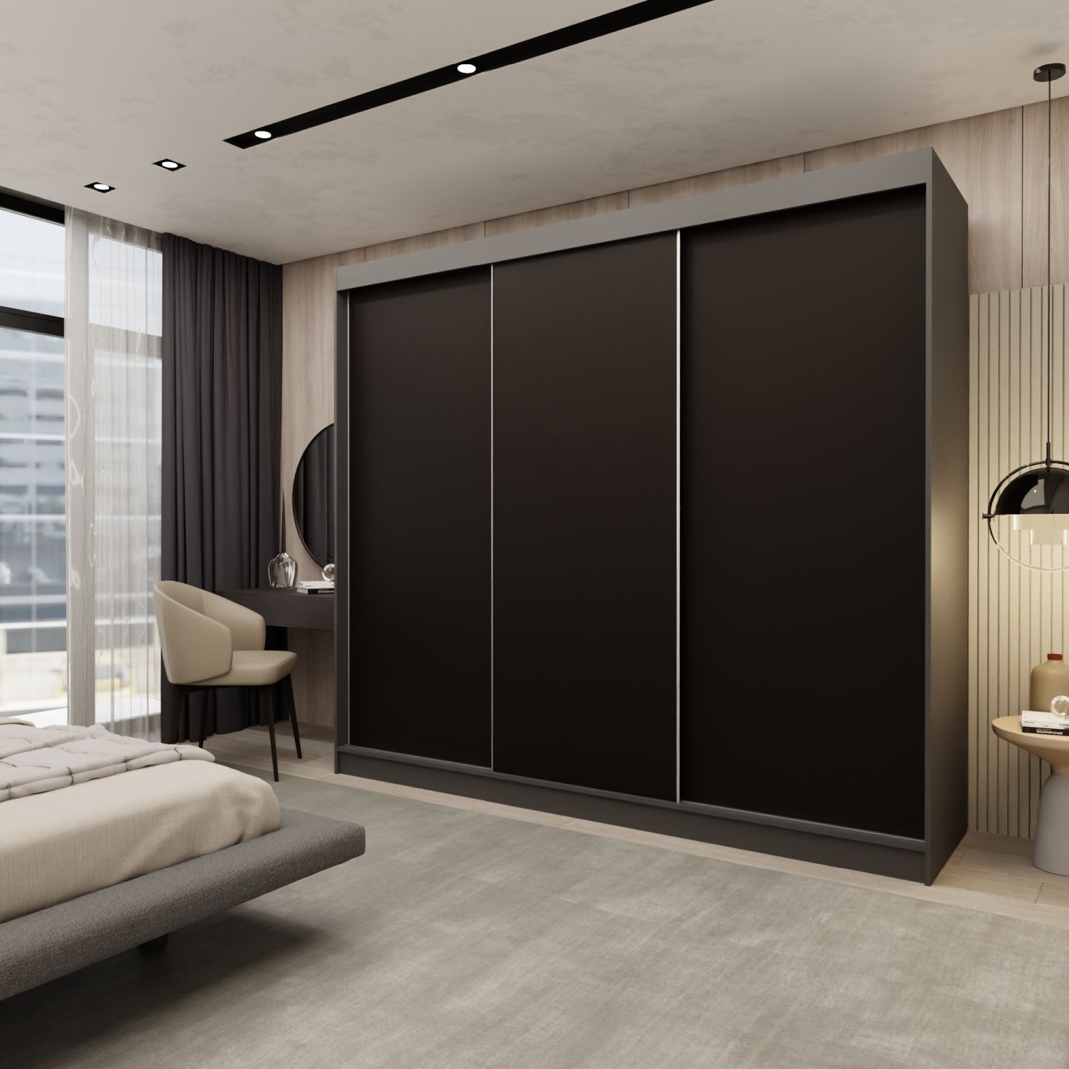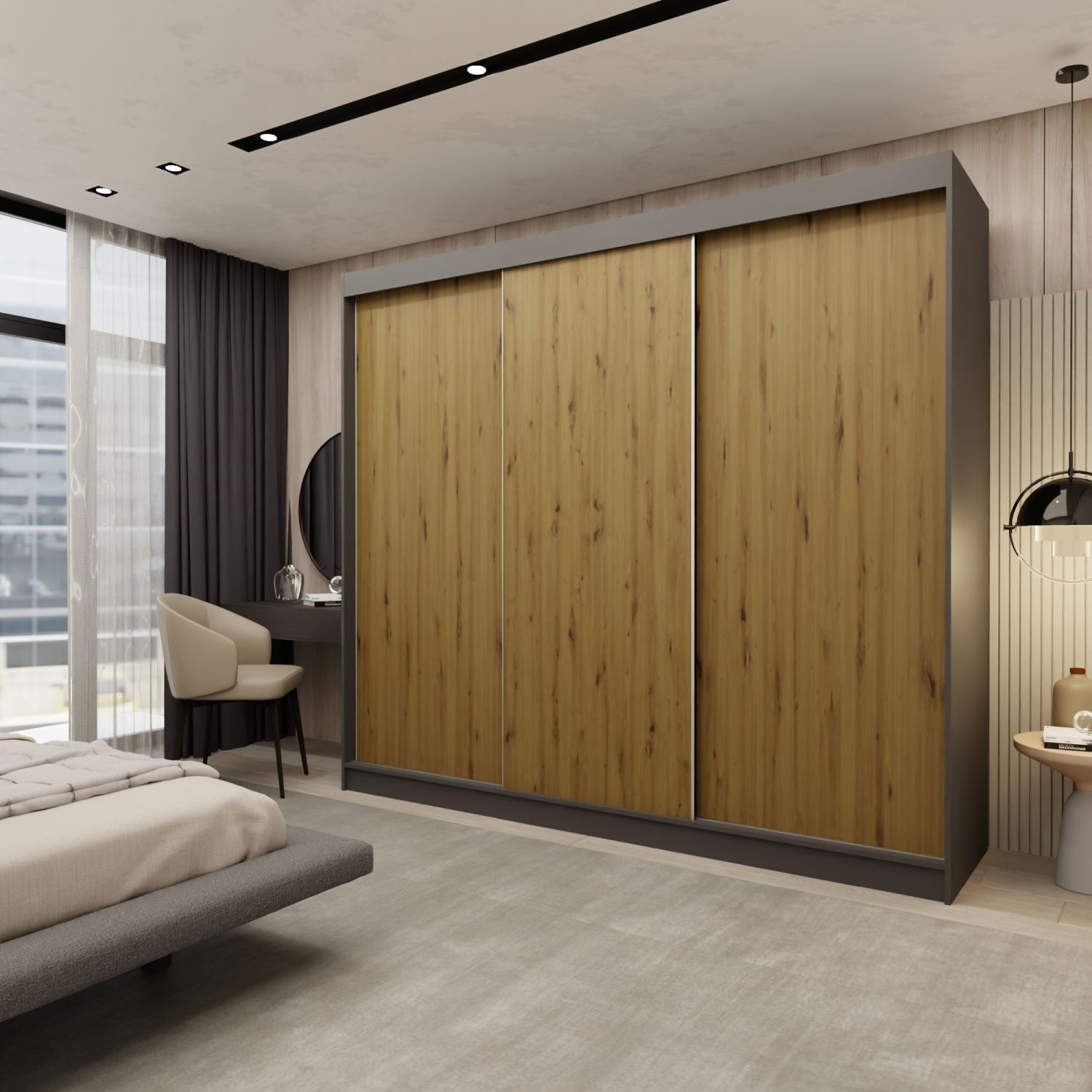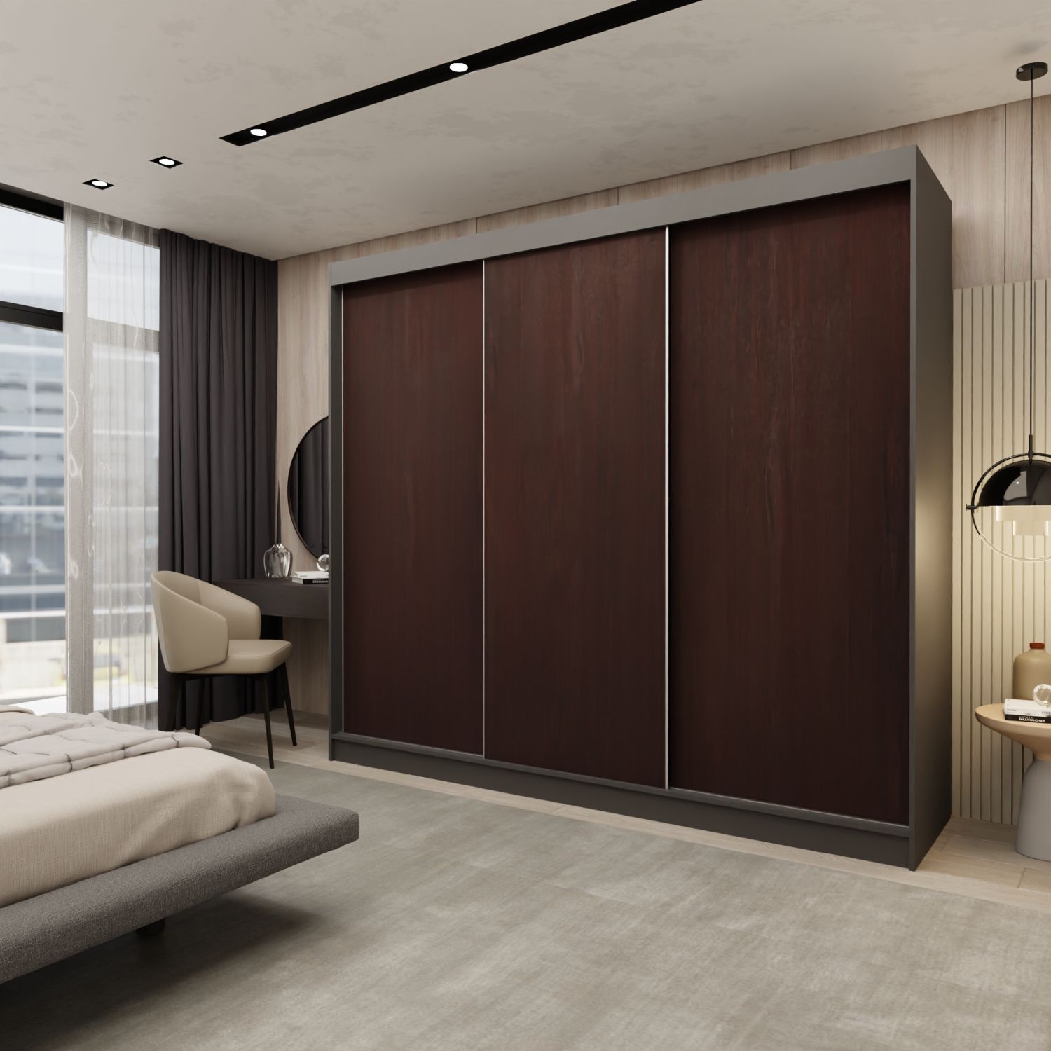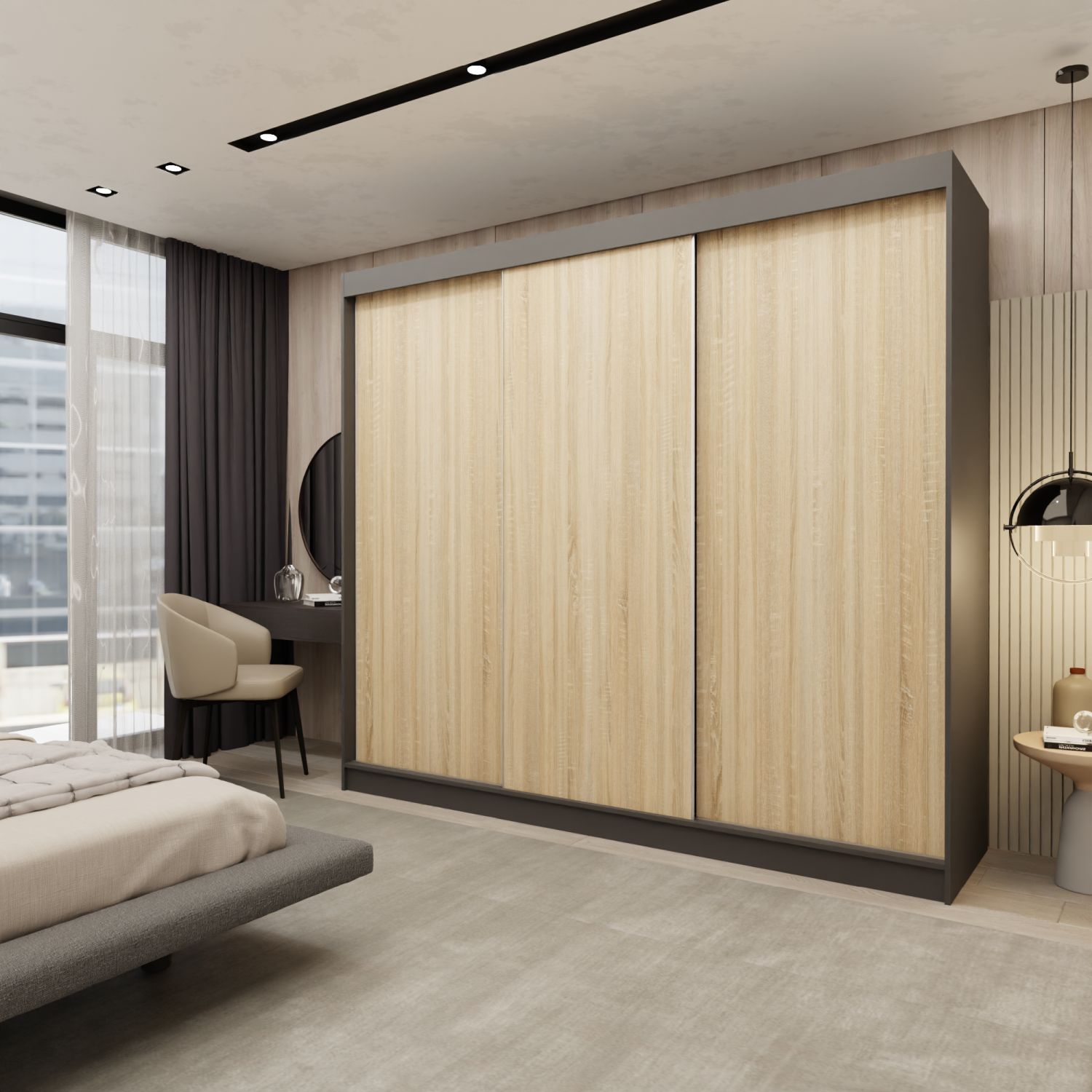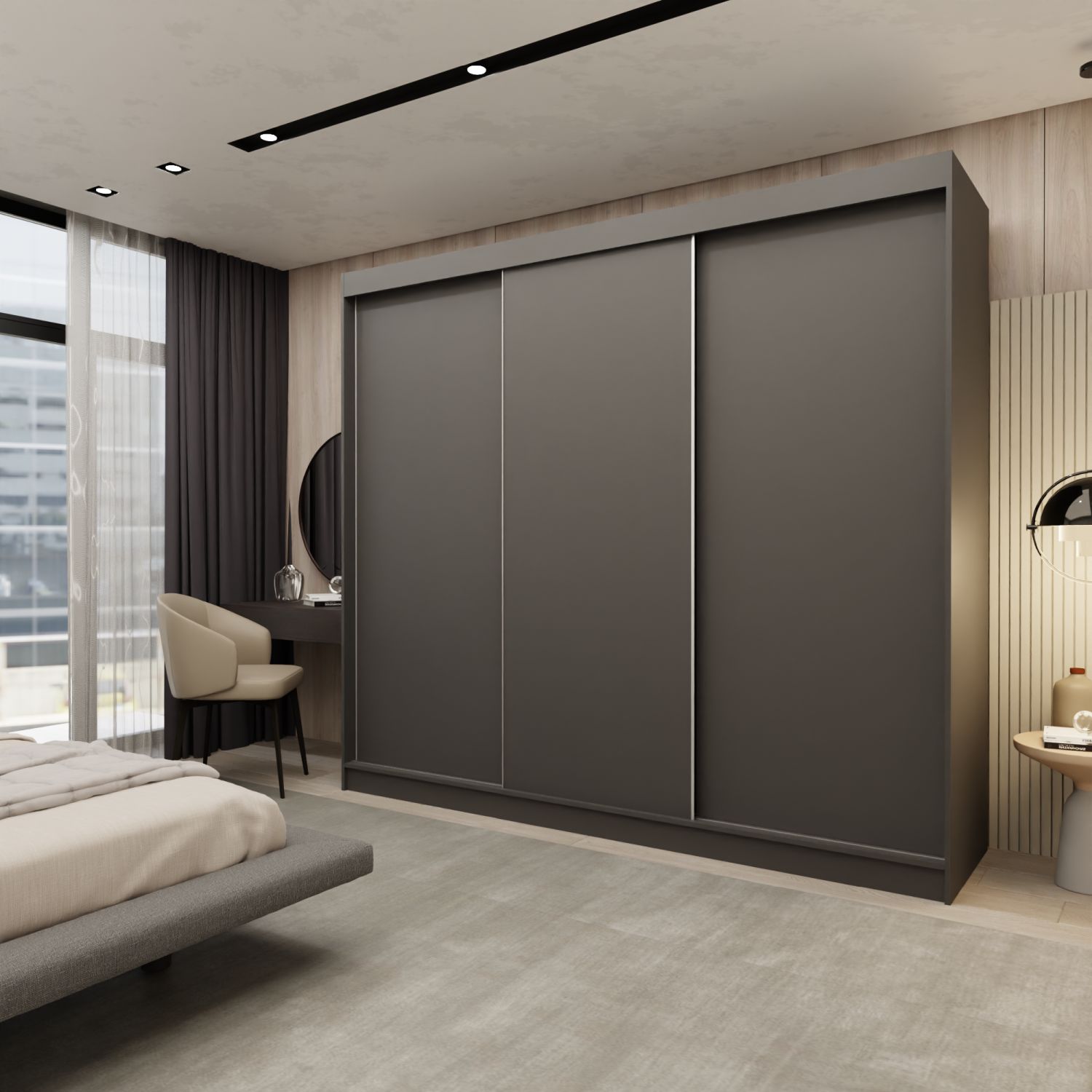 Szafa ORNELLA w kolorze grafitowy szary łączy funkcjonalność i elegancki minimalizm, stanowiąc doskonały wybór do współczesnych, stylowych wnętrz.